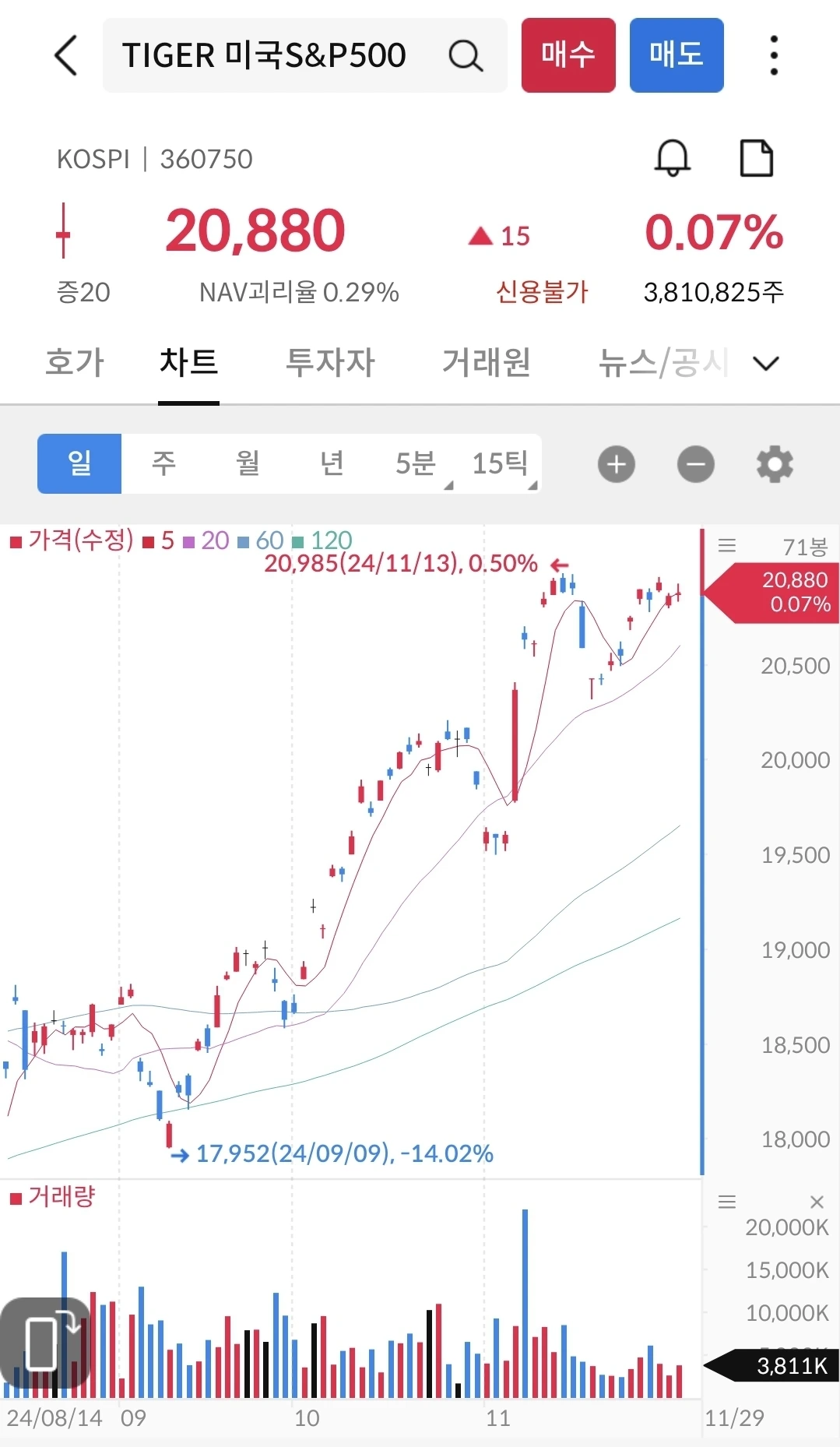 바닥이었던 9월말부터 직선으로 연결하면 아직까지는 지속 우상향 중이다. 환율 영향으로 미국에 직접 투자하는 것보다는 많이 오르지 않았지만, 그래도 2만원 상승했다. 앞으로도 쭉 상승 분위기가 이어질 듯 하다.