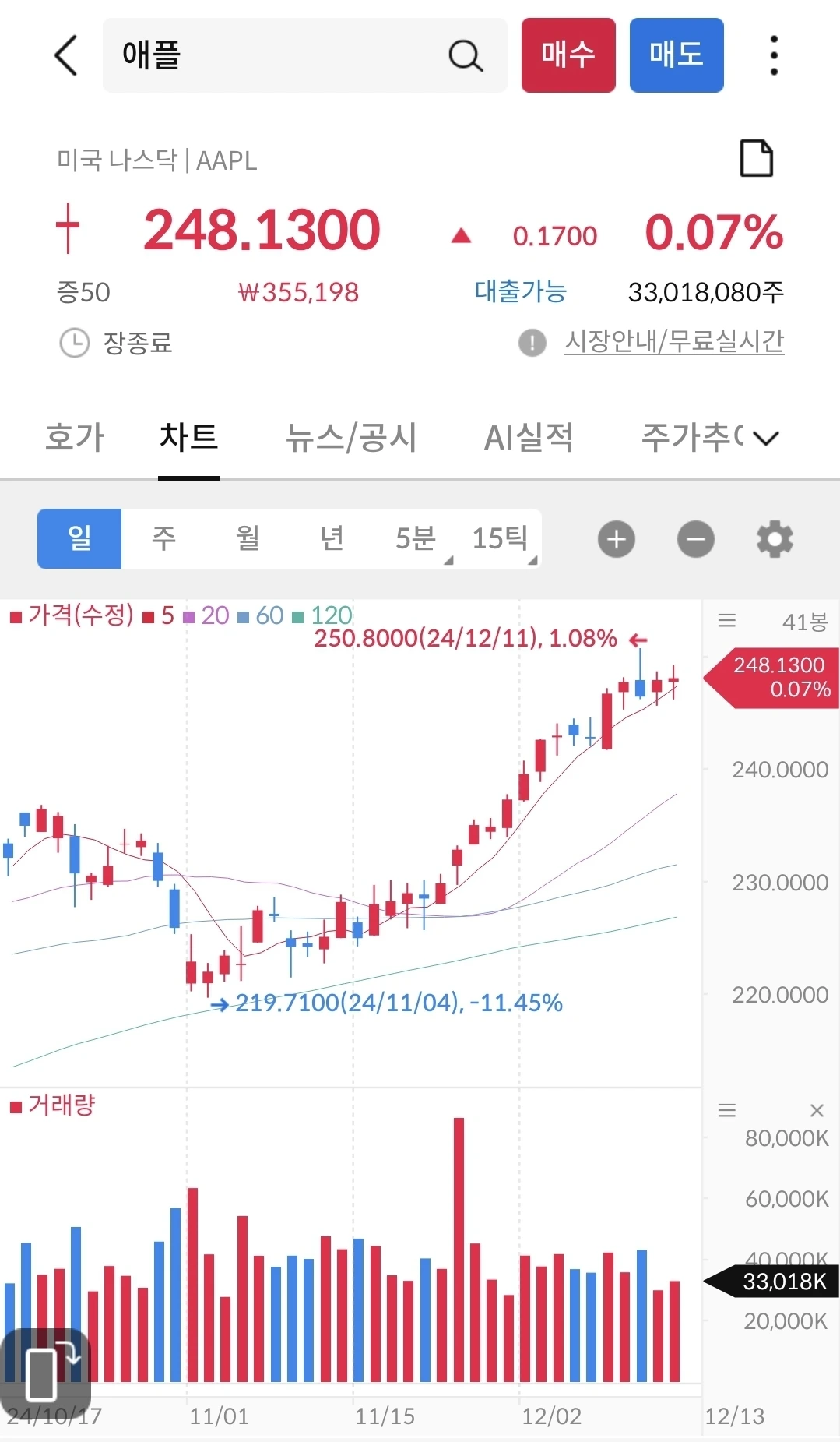 마소는 애플보다 크게 오르지는 않지만, 그렇다고 크게 떨어지지도 않는 듯 하다. 미래를 보고 현재가 제일 싸다고 생각하며 매수 중이다.
