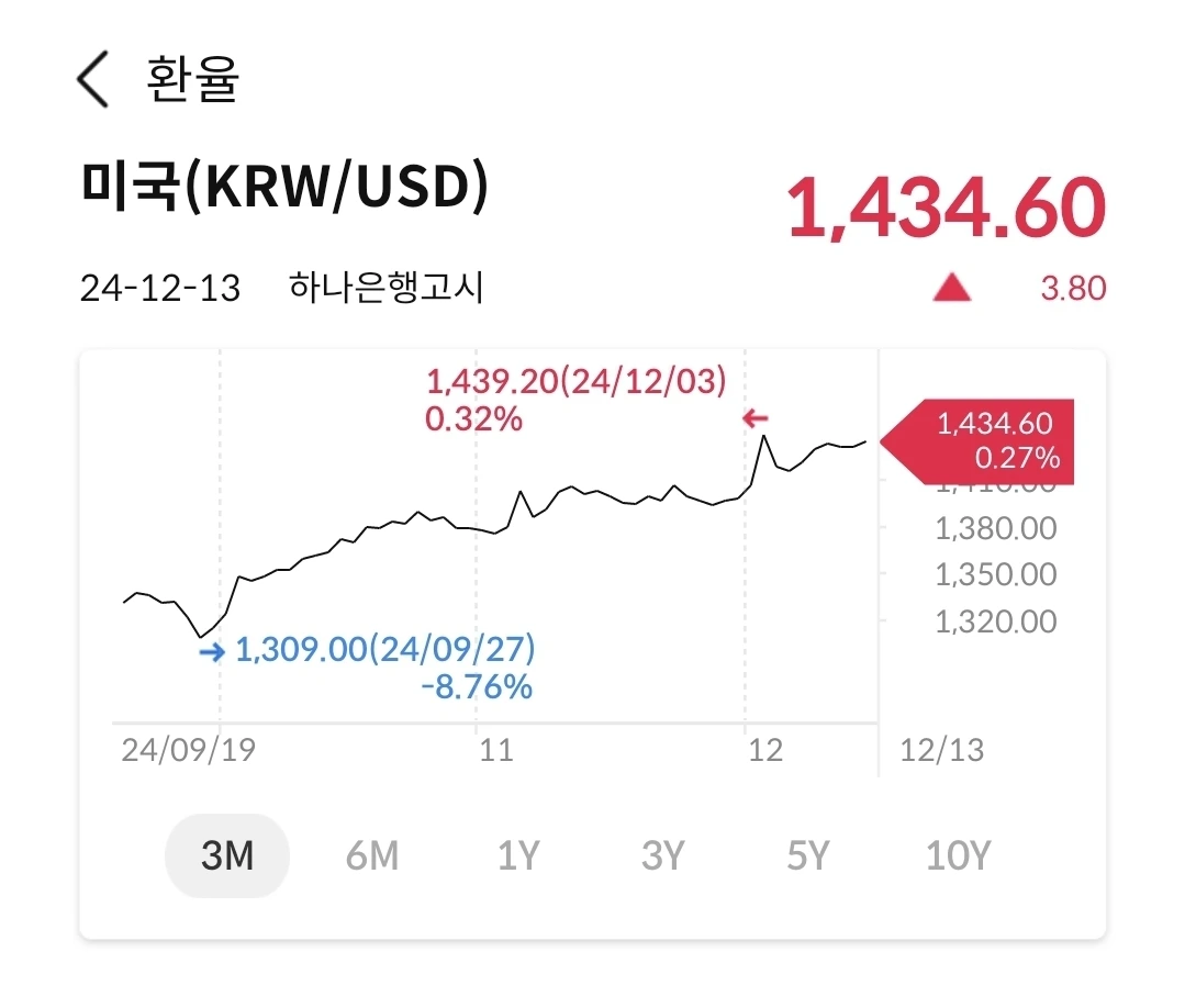 비상계엄발표 때 1439원까지 올랐다가 지금은 1430원대에 고착화 되었다. 금융당국에서 적극적으로 개입해서 1500원까지 안 갔다는 생각이 든다. 현재의 정국 불안은 당분간 1400원대를 지지할 것으로 보인다. 환이 더 이상 절하되지 않았으면 하는 마음이다.