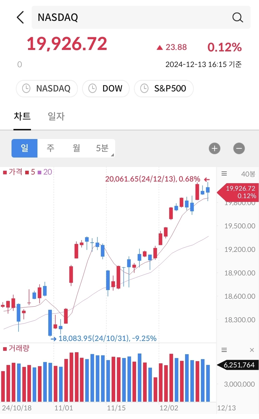 엔비디아의 하락을 테슬라와 브로드컴 등이 보완하면서 지속 상승하는 중이다. 11일에 사상 처음으로 2만선을 돌파하면서 주간 평균으로는 0.3% 상승마감 했다. 트럼프 당선 이후 지속 상승 그래프를 보여 주고 있다. 차주에 금리 결정에 따라서 그래프 방향이 정해 질 듯 하다.