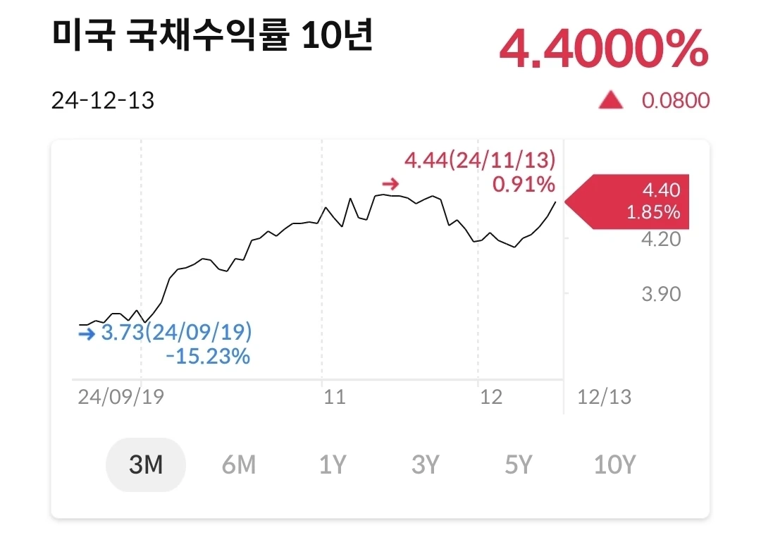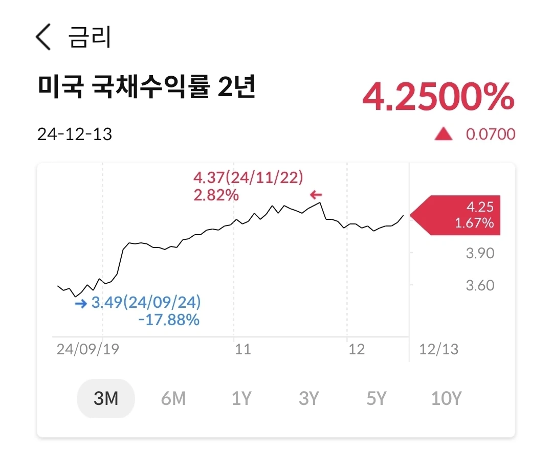 미국 국채수익률은 잠시 주춤하다가 상승하는 그림이다. 2년물 4.25%, 10년물은 4.4% 이다. 특히 10년물은 이번 주에 급격하게 상승했다. 지난 11월 13일에 최고점을 찍었는데, 이번 주에 그와 비슷하게 올랐다. 금리인하에 대한 기대감인지도 모른다.