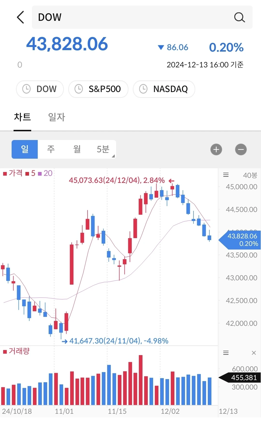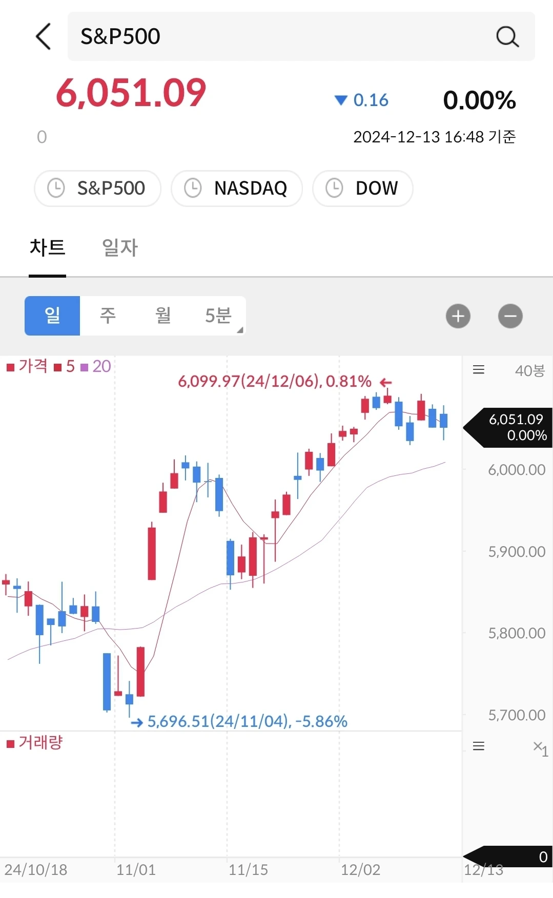 나스닥과 비슷한 상승패턴을 보인다. 이번 주에는 6만선도 돌파하고, 최고치 경신을 했다. 미국 시장을 잘 반영하고 있는 듯 하다. 이 또한 금리 인하가 결정되면 지속적으로 크리스마스 때까지 상승할 것으로 보인다. 언제까지 올라 갈지 궁금하다.