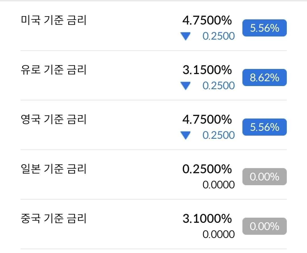 이번 주에는 유럽은행에서 0.25% 금리 인하를 했고, 캐나다는 0.5% 빅컷을 단행했다. 미국을 제외한 모든 국가에서는 경제 살리기 위해서 금리인하를 미국보다 더 공격적으로 진행 중이다. 유럽, 중국, 한국의 기준 금리는 3%대인나, 미국은 아직 4%대이다. 금리차가 1%가 넘게 난다.