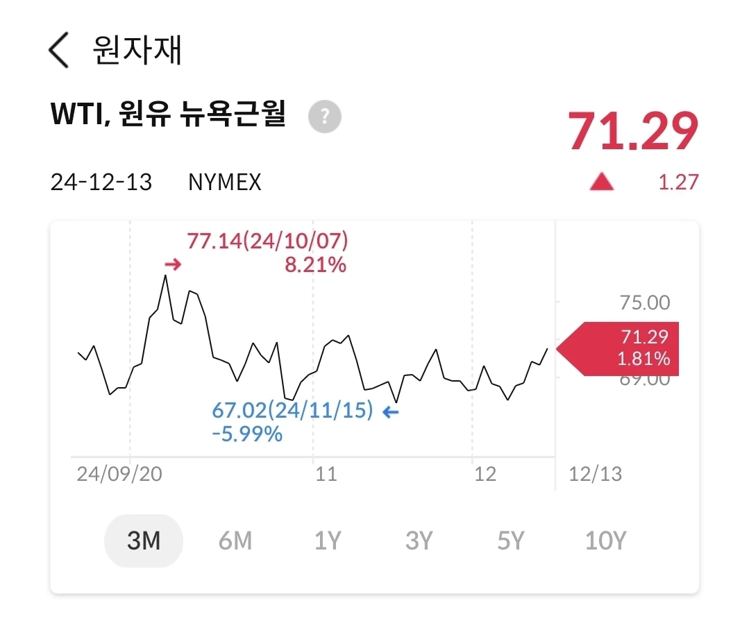 유가는 중동소식에 등락을 반복 중이다. 그나마 트럼프 당선 이후로 이스라엘 뉴스가 신문 지면에서 많이 사라졌다. 이번에 시리아 정부 붕괴 이후에 이란에 대한 위협을 한다는 뉴스가 나오기는 했으나, 아직까지는 그렇게 위협적으로 보이지는 않는다.