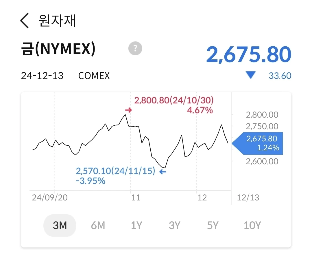 금가격은 꾸준히 상승하다가 트럼프 당선 이후로 급락하다가 다시 상승과 하락을 반복 중이다. 트럼프의 친 가상자산 영향으로 금가격이 떨어지고 대신에 비트코인 가격이 오르고 있다. 비트코인은 이미 10만달러를 넘었고, 20만달러를 향해서 달려 가는 중이다.