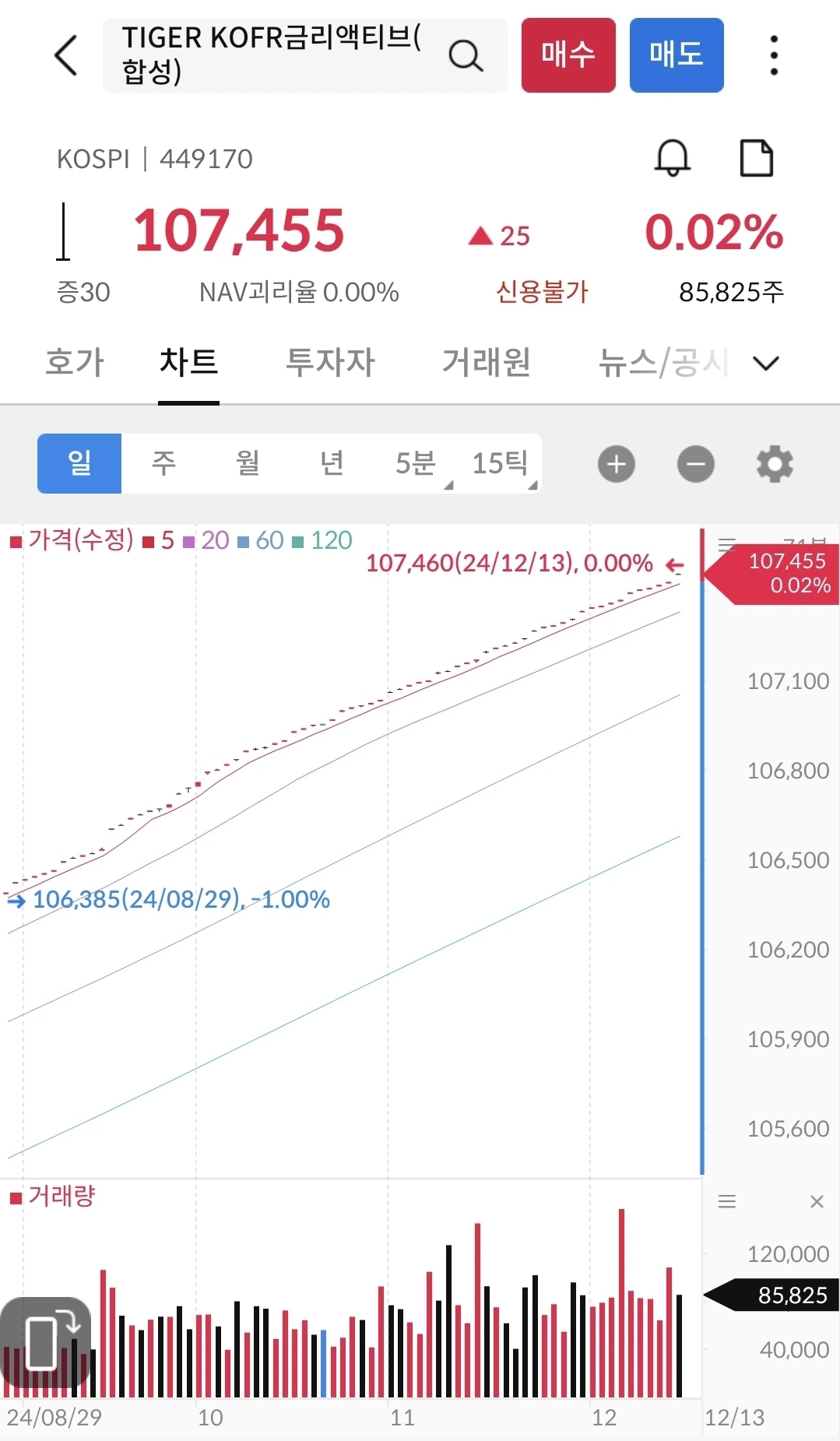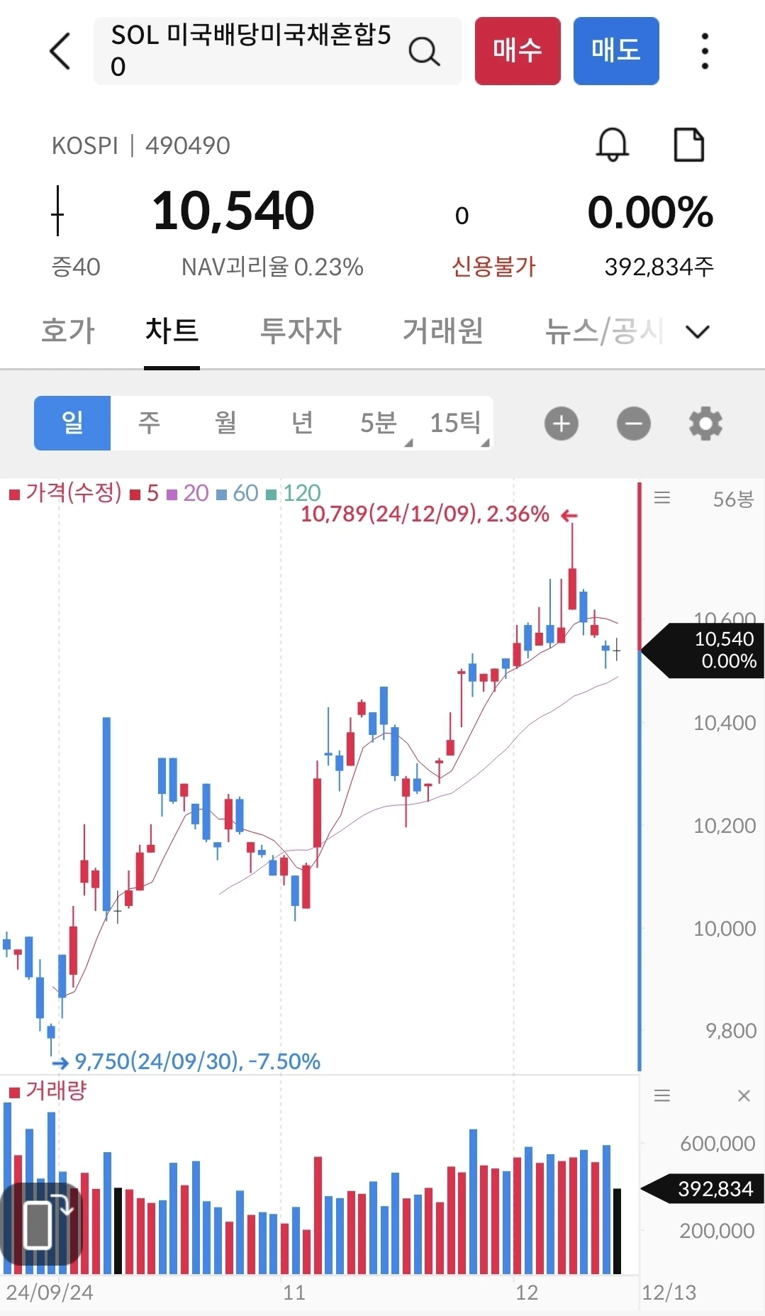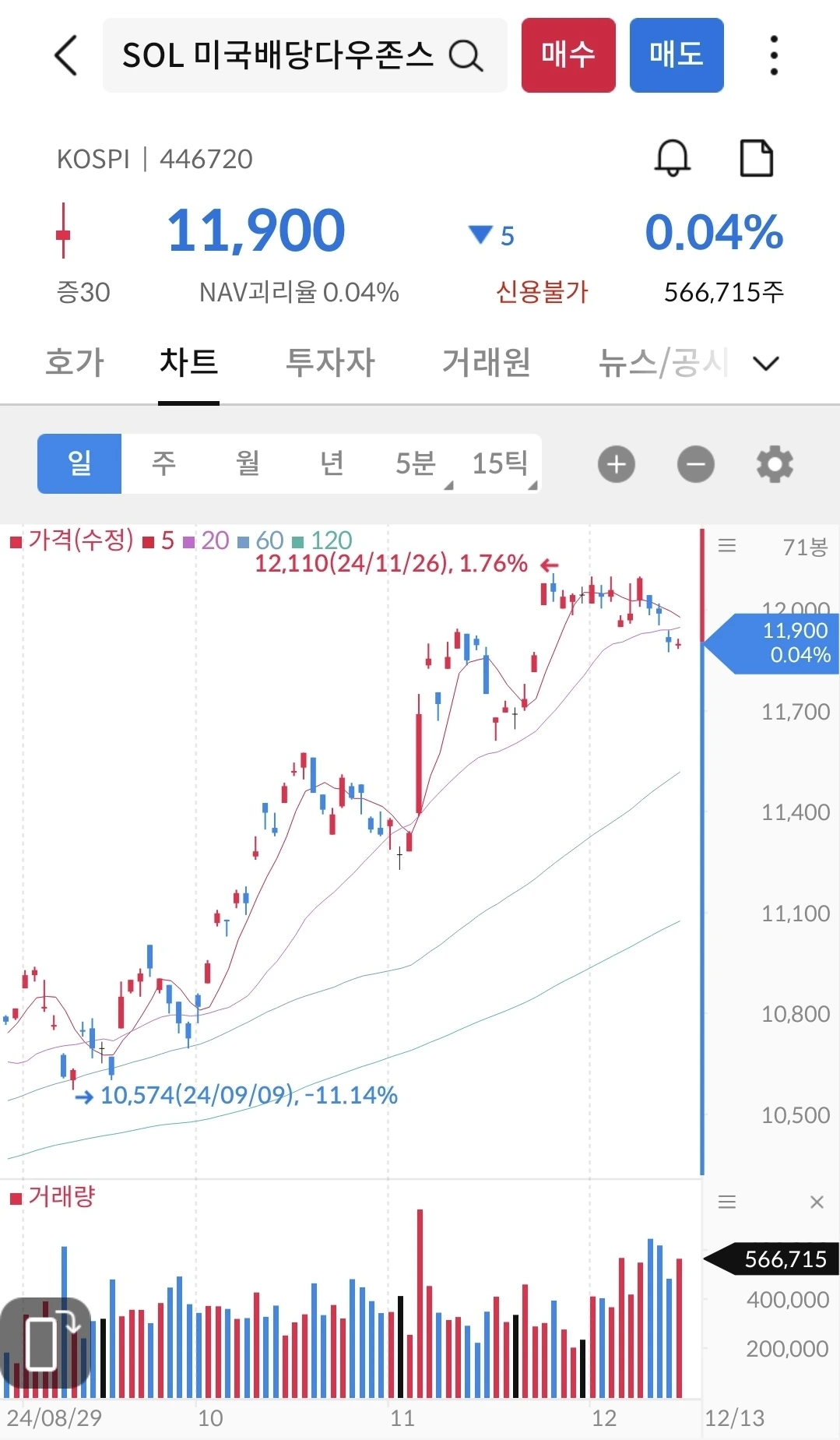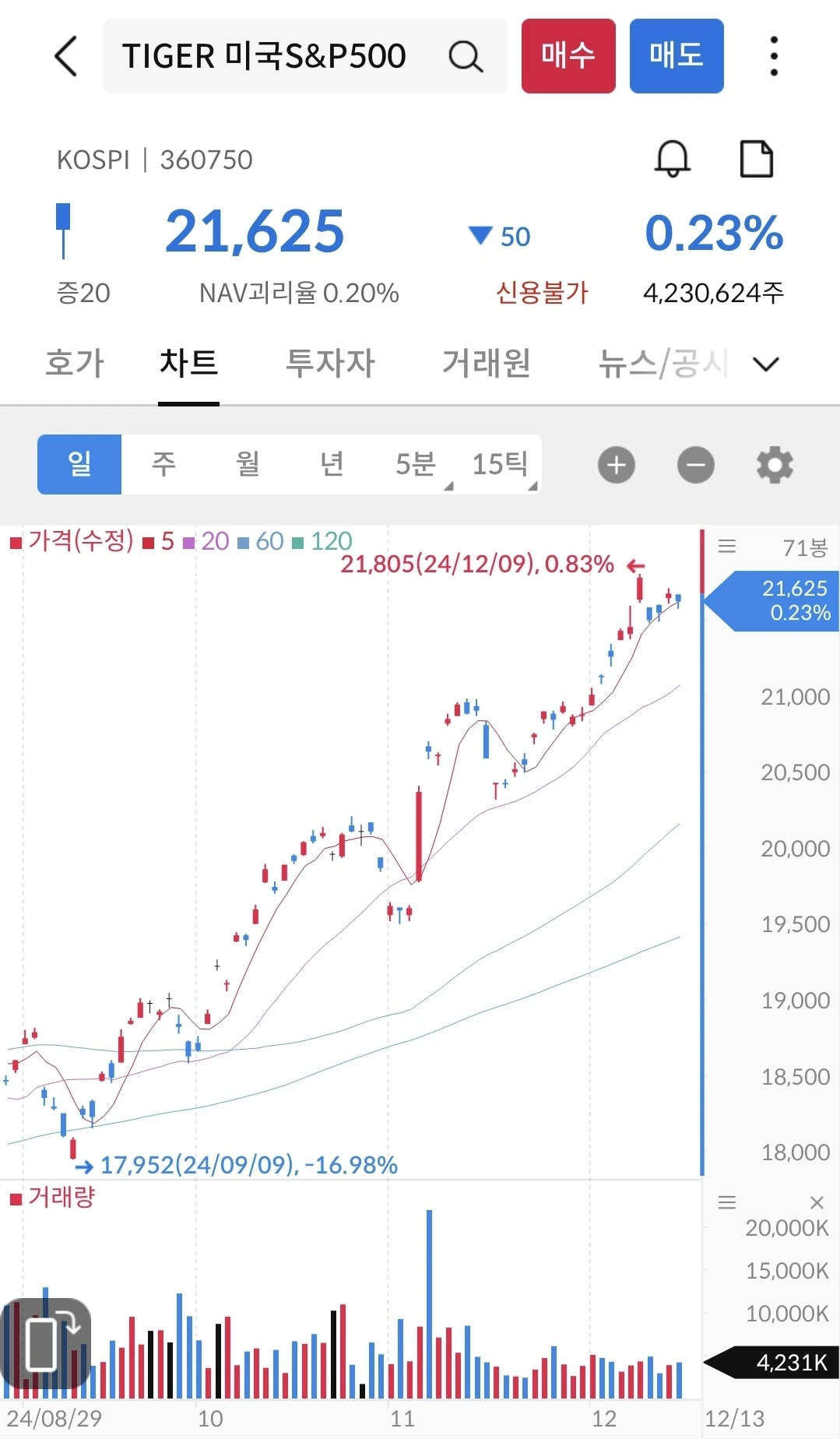 월요일에 10,789원 고점을 찍고 지금은 소폭하락 마감했다. 9일에 S&P500도 고점을 찍었는데, 무슨 일이 있었나 궁금하다. 꾸준히 분할매수 하자.