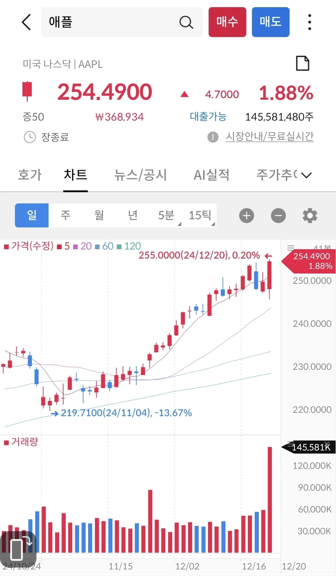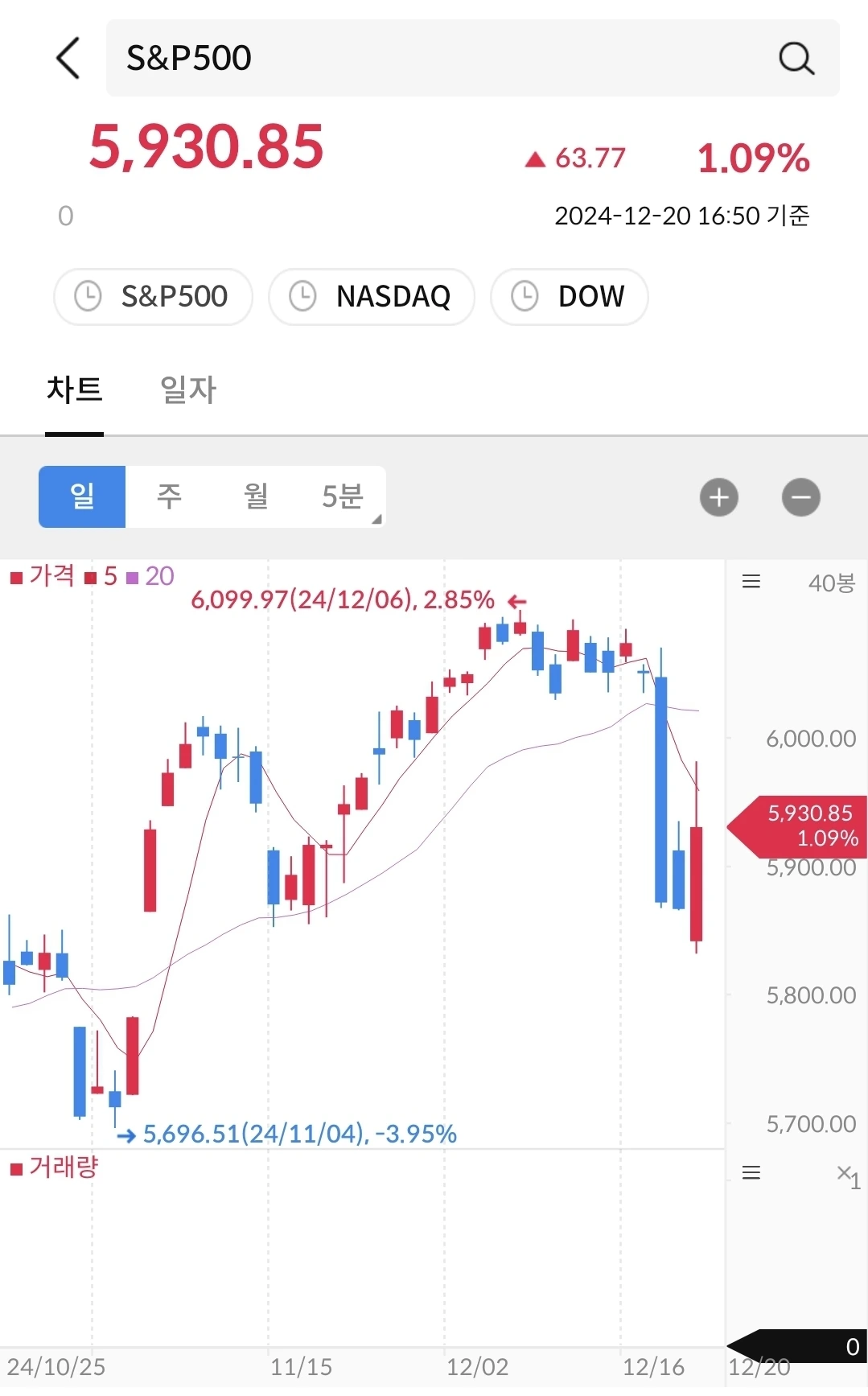 지난 2주간 꾸준히 하락하다가 금요일에 반등에 성공했다. 금리인하 후에도 꾸준히 하락하더니, 미국 경제지표 발표에 반등을 한 것이다. 그러나, 앞으로 상승할지 하락할지는 모른다. 다음 주 크리스마스 전에 어떤 방향으로 갈 지 지켜보자