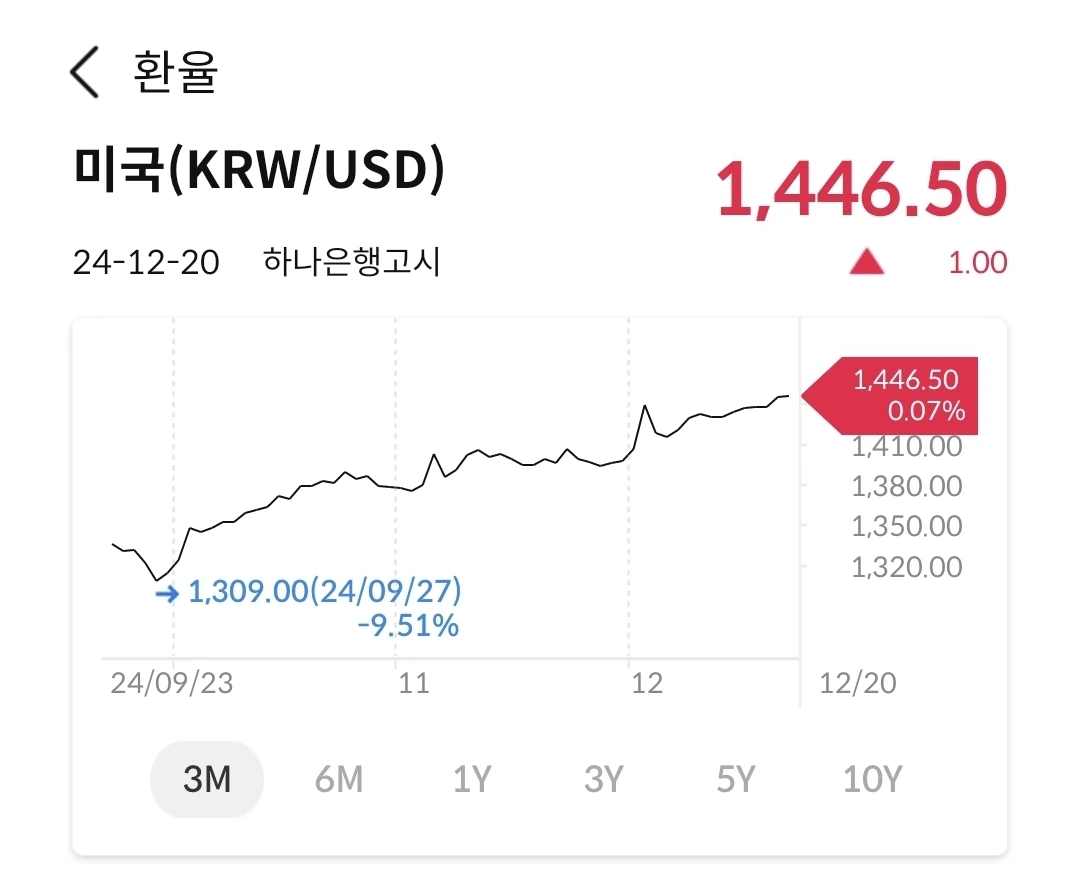 원화 절하가 1309원에서 꾸준히 우상향하면서 1450원을 넘나들고 있다. 전혀 예상하지 못했던 비상계엄으로 인해서 이제는 1450원대가 고착화되었고, 현재 정부당국에서 가지고 있는 달러를 쏟아 부어서 환율이 1500원이 안 되게 막고 있다. 언제까지 할 수 있을까?
