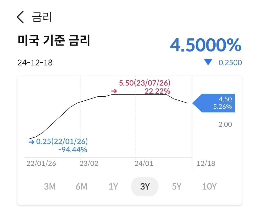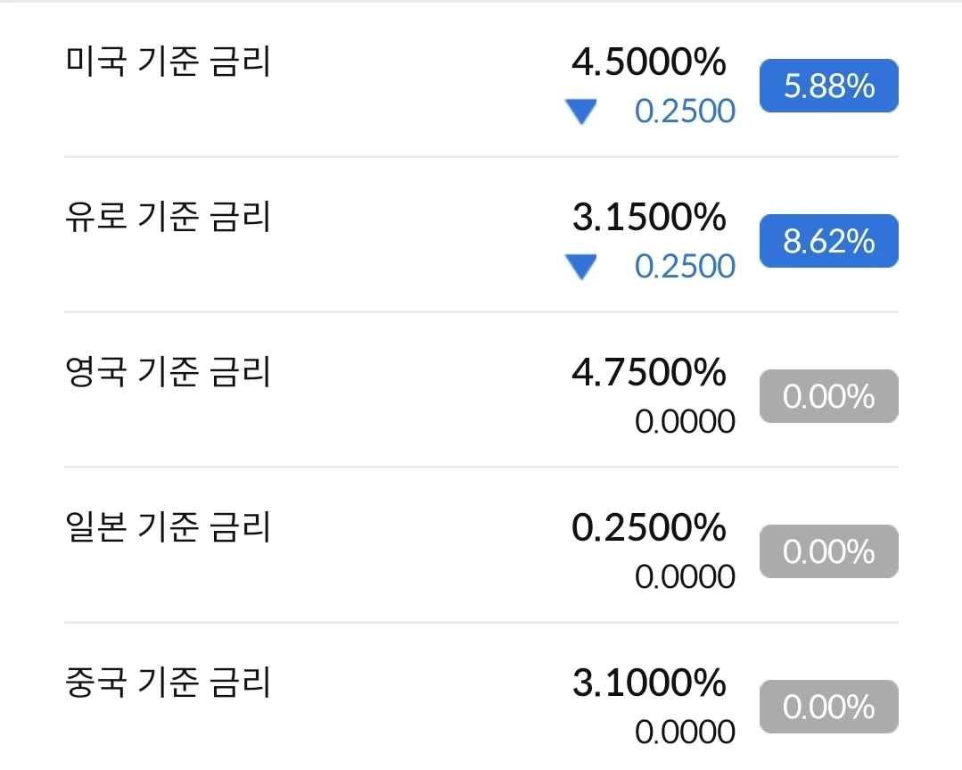 미국이 기준금리를 0.25% 내렸다. 그래서, 4.5%가 되었다. 내년 1월에는 동결될 확률이 높다고한다. 우리 기준금리도 경제가 안 좋아서 내릴 확률이 높다. 금리 인하는 현재 상황에서는 계륵 같은 존재다.