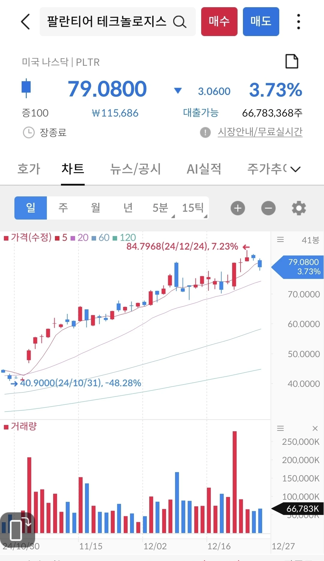 지난 2개월 사이에 40불에서 80불까지 올라 갔다. 인공지능과 전쟁으로 최대 수혜를 본 회사가 아닐까. 회사 가치가 이 정도일지는 잘 모르겠지만, 시중에 돈이 많이 풀리다 보니 급작스럽게 오른 주식이다. 2022년부터 지켜보고 있었는데, 6월부터 꾸준히 상승하더니 80불이 넘었다가 왔다.