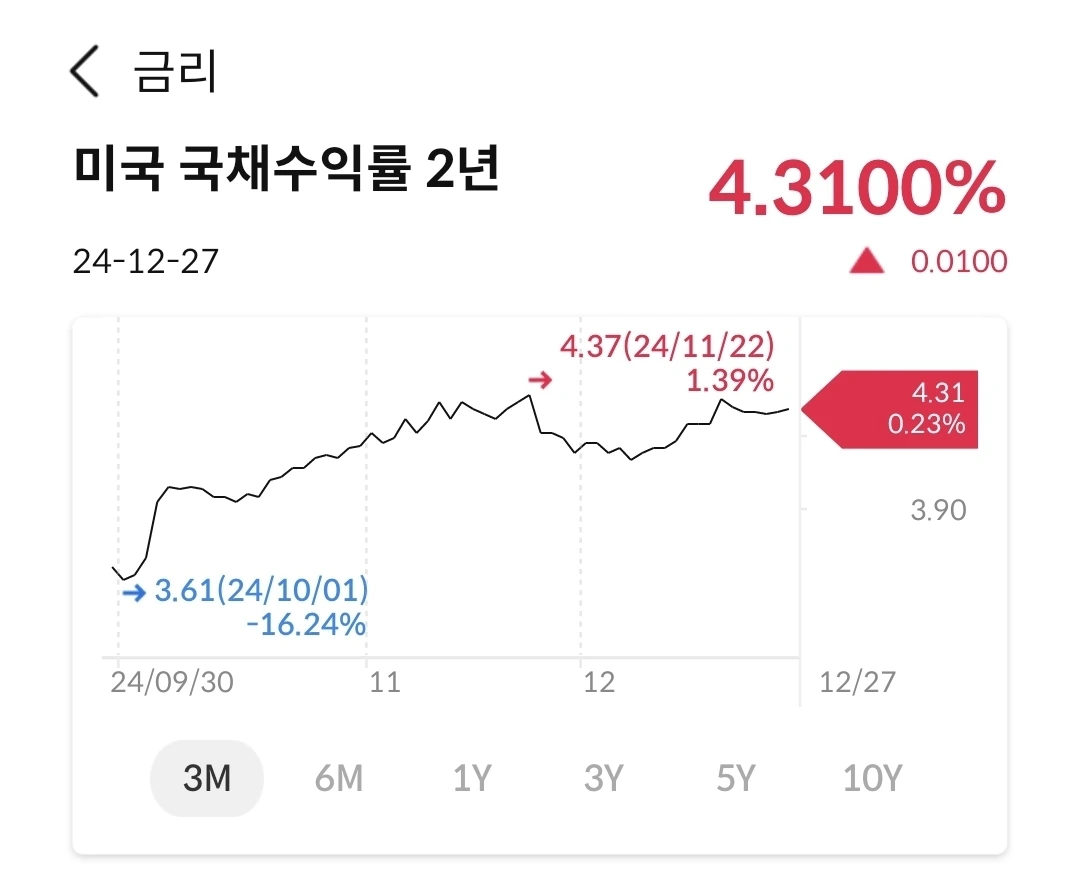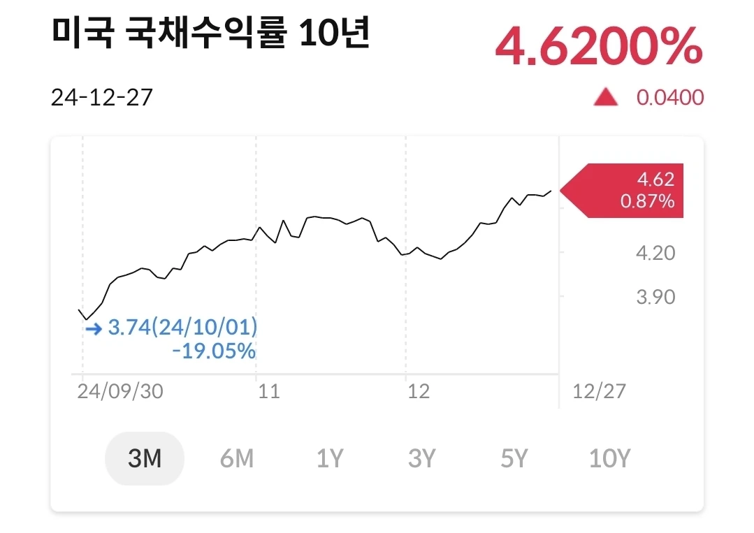 미국채는 미국 금리와 연결이 되어 있고, 연준에서 금리인하 속도 조절한다는 메시지에 수익률이 상승 중이다. 특히 10년물에 대한 상승이 크다. 지금이 미국채 가격이 싸다는 뜻이기도 하다. 분산투자를 하고 있다면, 지금은 미국채를 사도 된다는 해석이 될 수 있다.