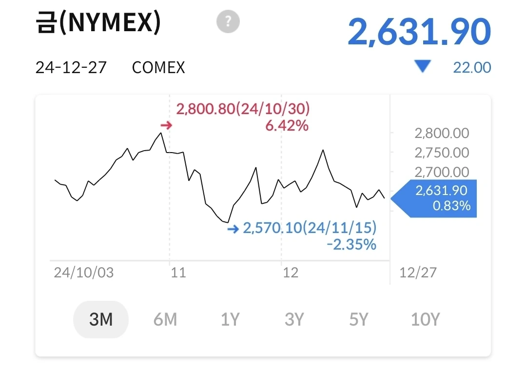 금가격은 10월 30일에 2800을 찍고 하락 > 상승 > 하락을 반복 중이다. 다시 2800을 딛고 올라가기에는 상승여력이 부족해 보인다. 그리고, 올해 너무 많이 올라서 이 정도 수준도 높은 것이라 생각된다. 요즘에 비트코인과 비슷하게 움직이는 경향이 있어 보이고, 안전 자산으로 비트코인과 경쟁하는 것이 아닐까. 아직은 금에 대한 선호가 비트코인보다는 높다. 일단 지켜보자.