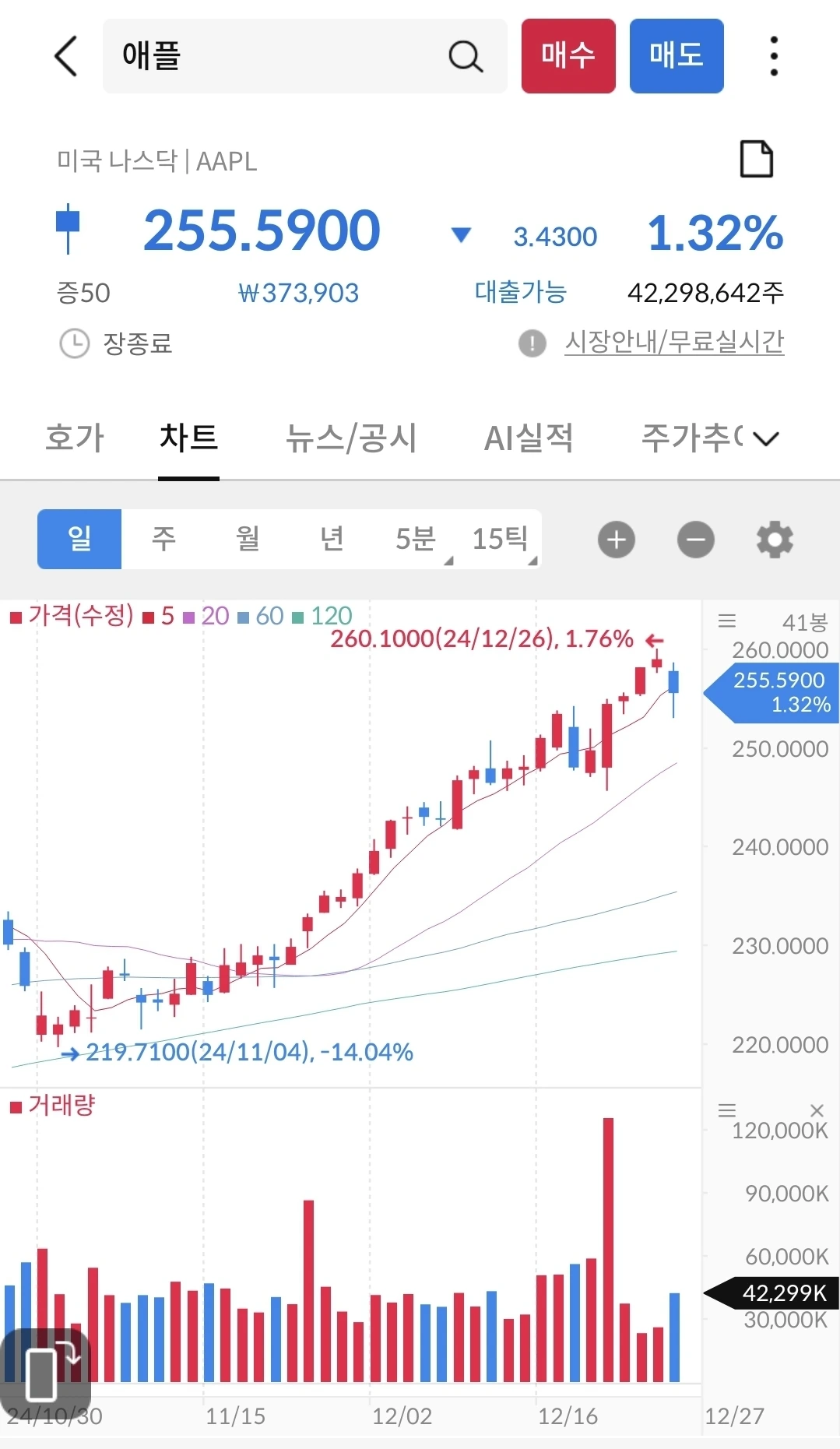 팔란티어와 애플은 우상향 중이다. 올해 2월에 애플 주식을 200불에 다 팔았다. 그리고, 마소로 갈아 탔다. 140불에 사서 팔았기 때문에 나름 수익을 봤는데, 이렇게 260불까지 갈지는 몰랐다. 하지만, 미래를 보고 투자하는 것이기에 지금의 애플은 성장할지 몰라도 3년 뒤에는 마소가 더 성장할 것 같아서 갈아 탄 것이다.