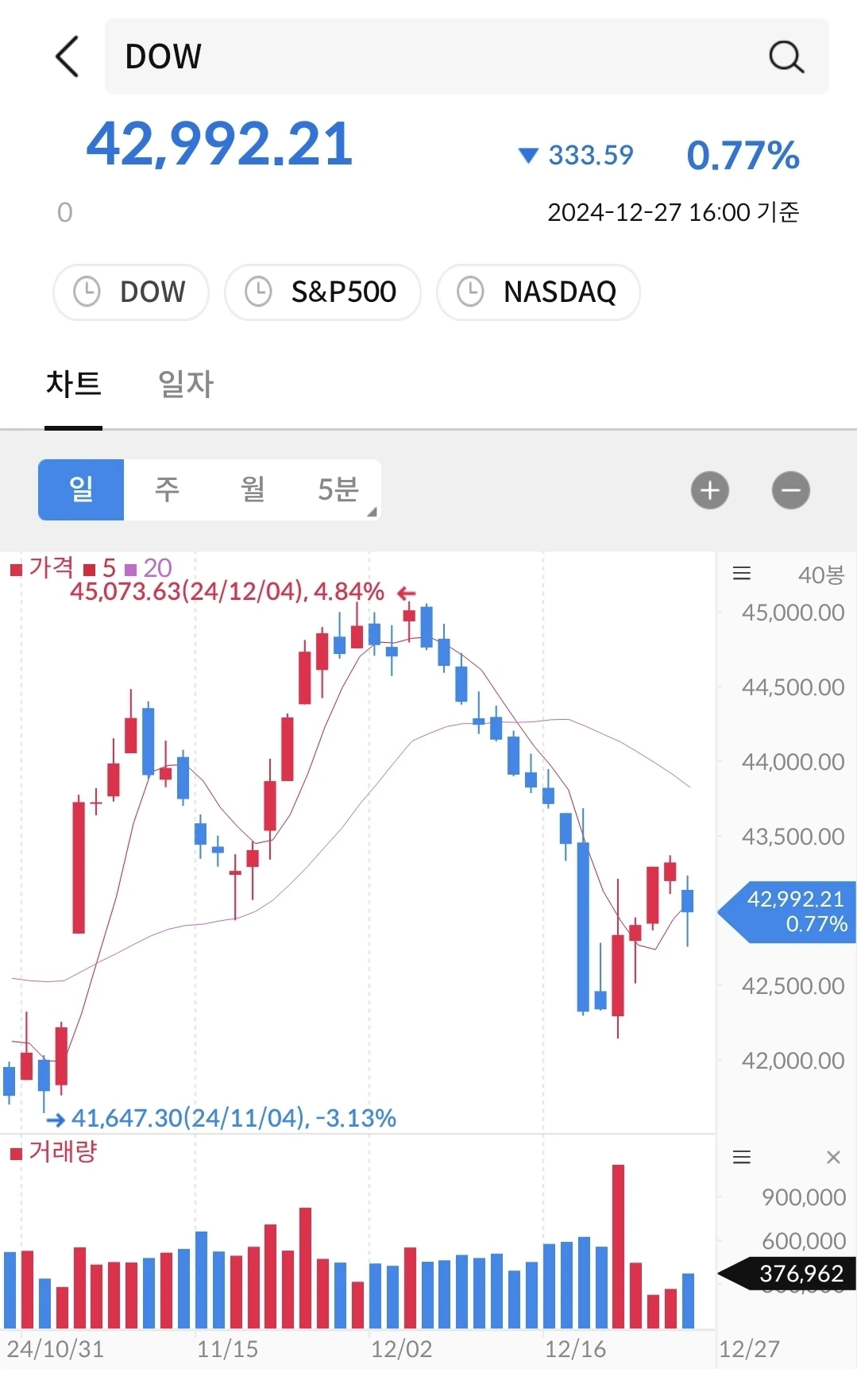 요즘 나스닥과 S&P500지수는 같은 패턴으로 움직인다. 10월말과 비교하면 우상향으로 움직이는 중이다. 다음 주에는 2024년 장마감이 오는데, 상승할지 아니면 하락할지 궁금하다.