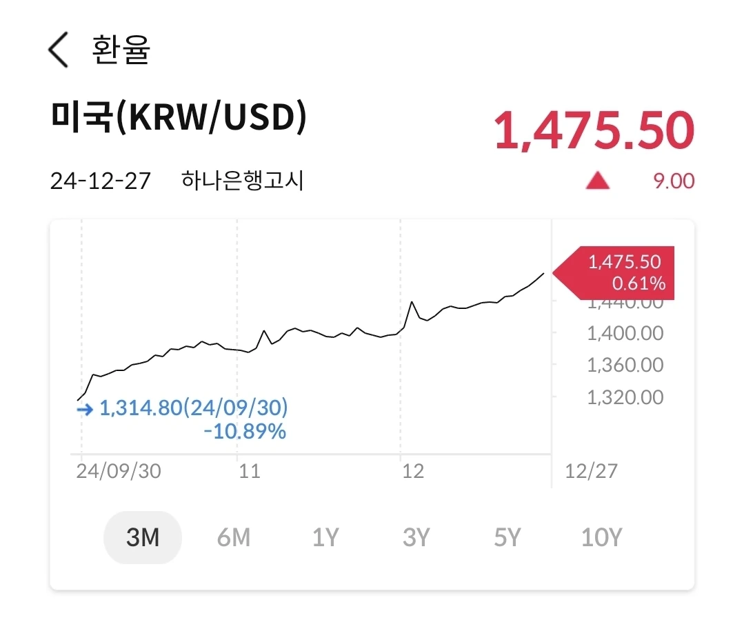 1480원까지 터치하면서 꾸준히 우상향 중이다. 9월 30일에 1314원이었는데, 지금은 160원이나 올랐다. 짧은 시간에 이렇게 무섭게 오르는 경우는 많지 않은데, 우리 경제의 펀더멘털이 많이 흔들리고 있다. 정치의 불확실성이 경제로 옮겨와서 외국인들의 끊임없는 매도로 환이 방어가 안되고, 지속 절하 되는 중이다.