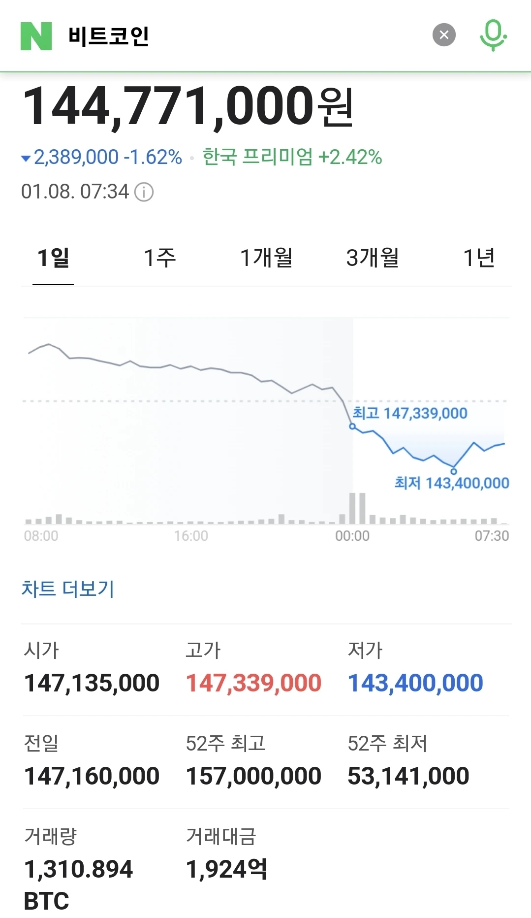 1) 비트코인, 5.01% 떨어진 1억 4463만원