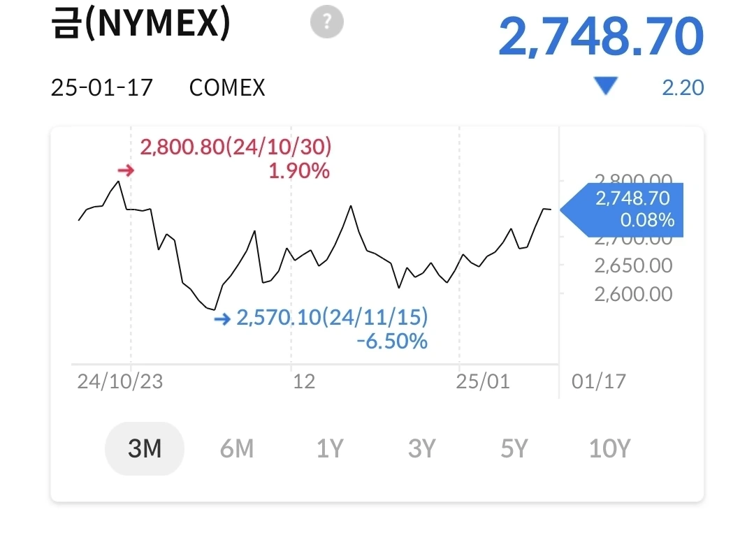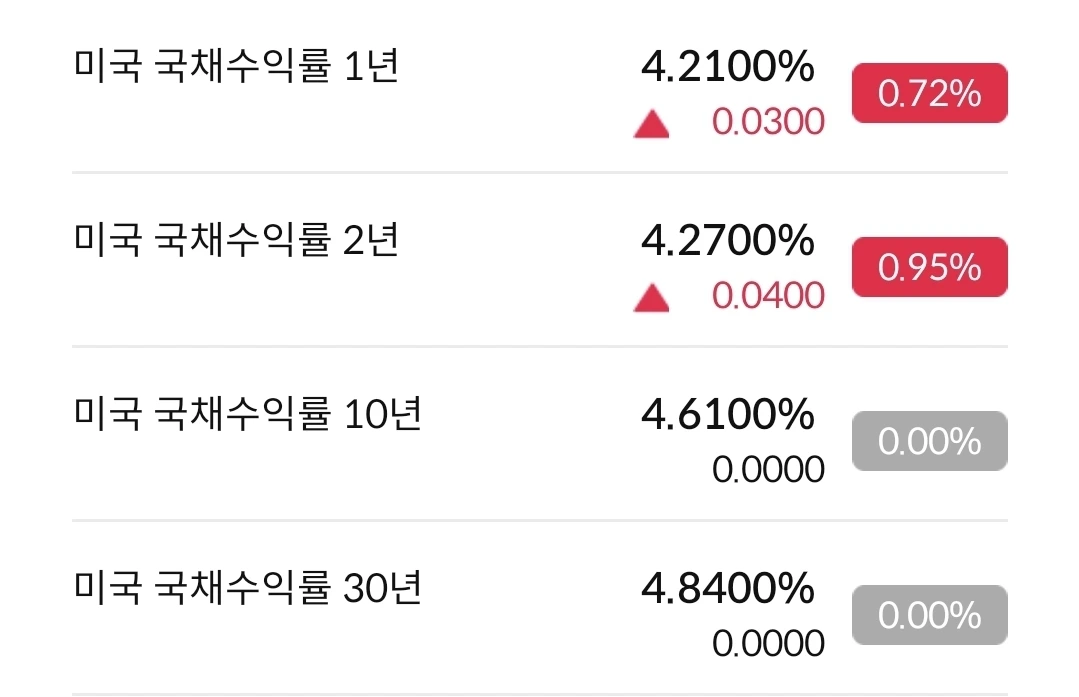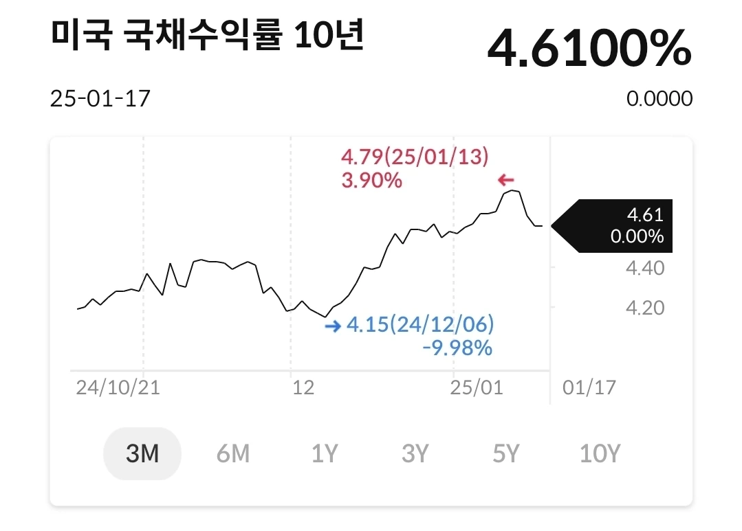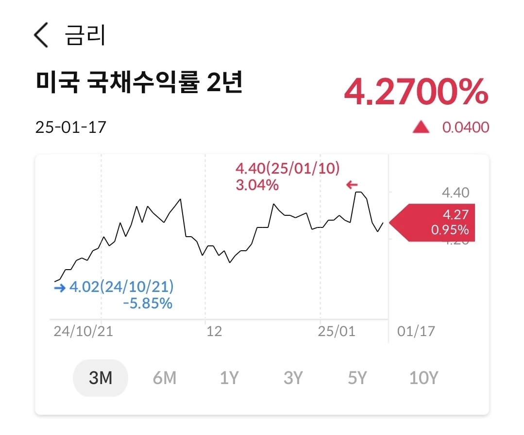 크게 상승 중이다. 국채 가격이 하락한다는 의미이기에 현재가 미국채를 매입하기에도 좋은 시점인듯 보인다. 그러나, 어디까지 올라갈 지는 모르겠다. 금리인하와 연결되어 있는데, 불확실성이 어느정도 해결되어야 한다.