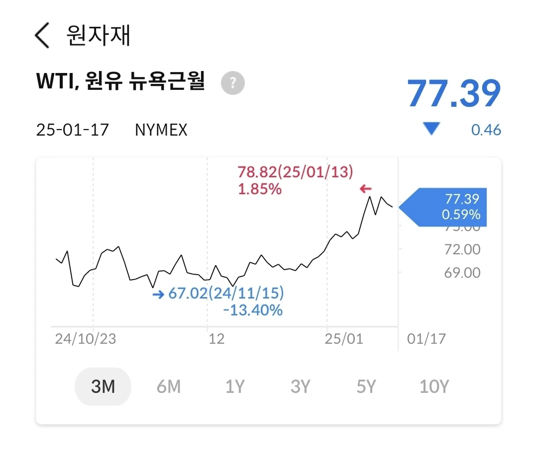 러시아 제재로 유가는 지속 상승을 했다. 78불까지 치고 올라갔다가 약간 하락 중이다.