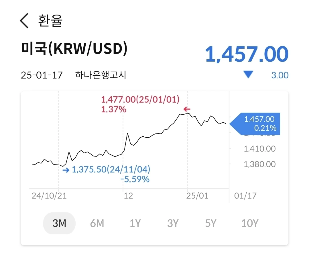 1477원 고점을 찍은 뒤 하락하는 모습이다. 지속적으로 하락여부는 트럼프 취임 후에 알 수 있다.