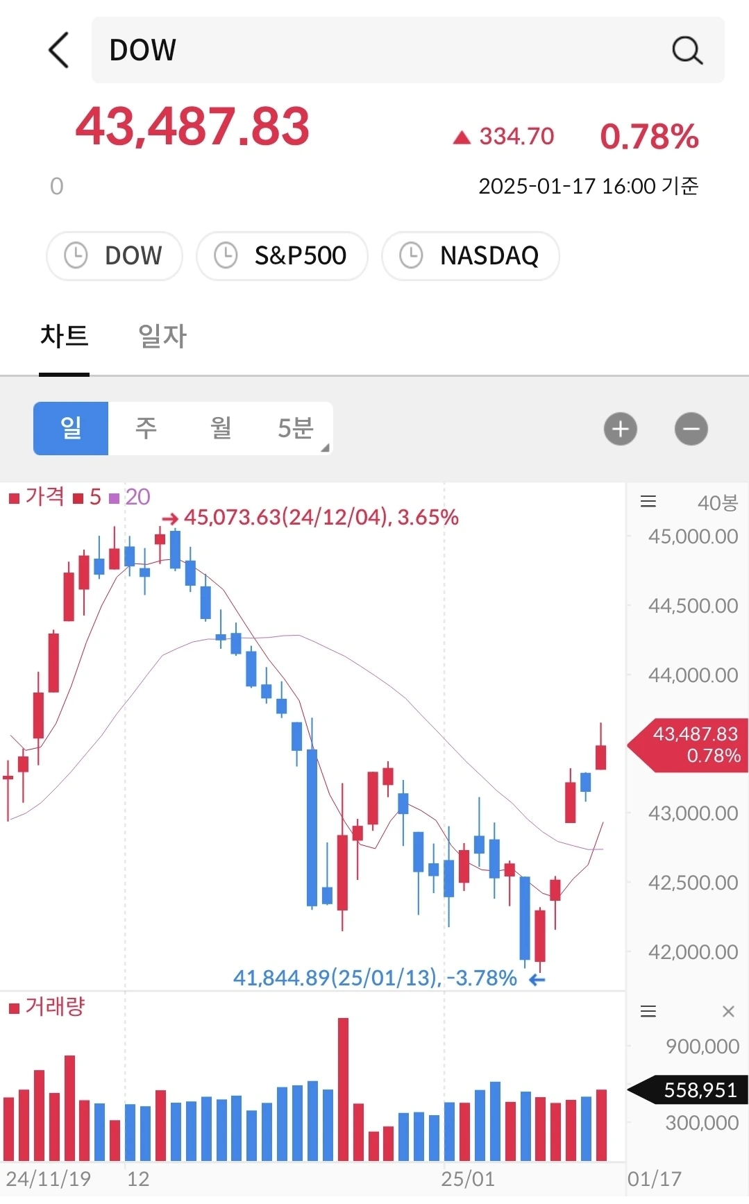 긴 하락 후에 상승 모습이다. 트럼프 취임 전이라서 지속적인 상승이 이어질지 궁금했었다.