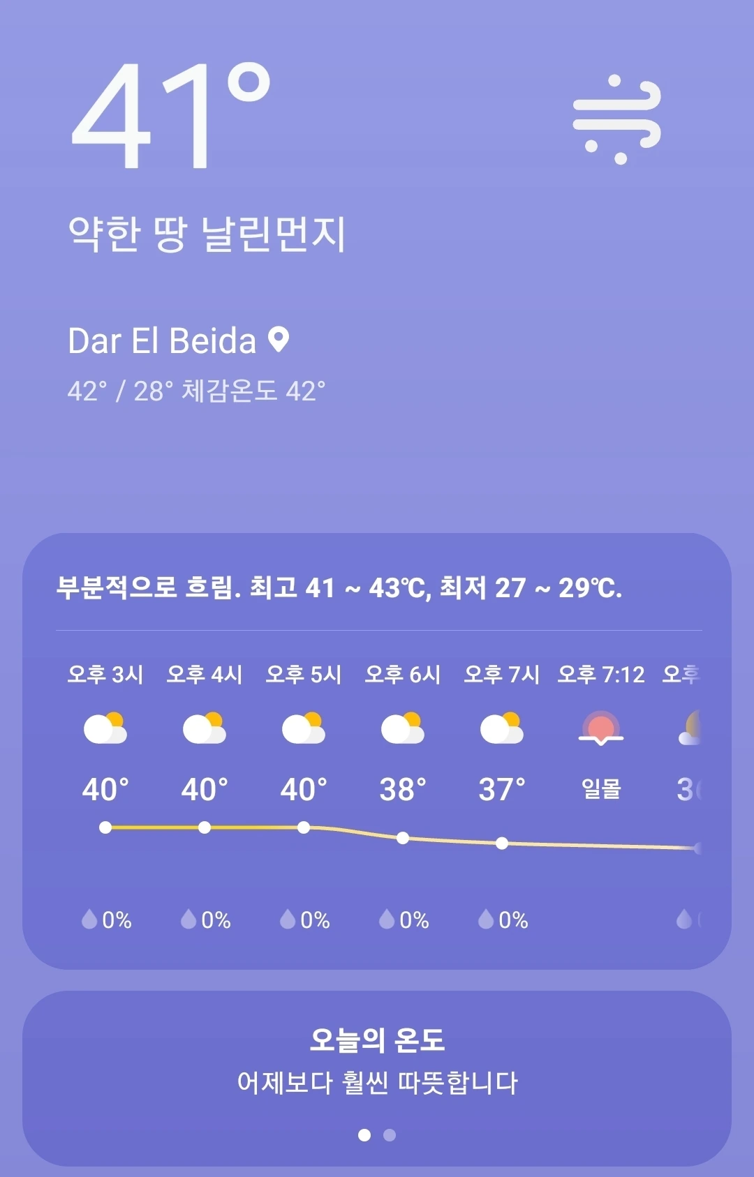 한국의 황사보다 5배 이상은 심해 보이는 공기 질이다. 사막의 모래 바람이 아니고서는 설명이 잘 안된다. 비가 거의 안 오다 보니, 건조한 날씨에 땅에 있던 흙먼지가 대기 중으로 들어와서 전반적으로 노란색의 하늘을 보여 줬다. 공기의 질이 안 좋아지니, 열이 들어와서 나가지 못하는 현상의 발생으로 열둠의 생겨서 국지적으로 날이 엄청 뜨겁다. 알제에서는 이상 기온이 40도~ 50도 사이에서 결정이 된다. 과거에도 이렇게 40도가 넘은 적은 그렇게 많지 않다고 했는데, 올해 유독 덥다고 한다. 지구가 뜨거워 진다는 것을 몸소 느낄 수 있는 하루다. 뜨겁다. 진정으로.