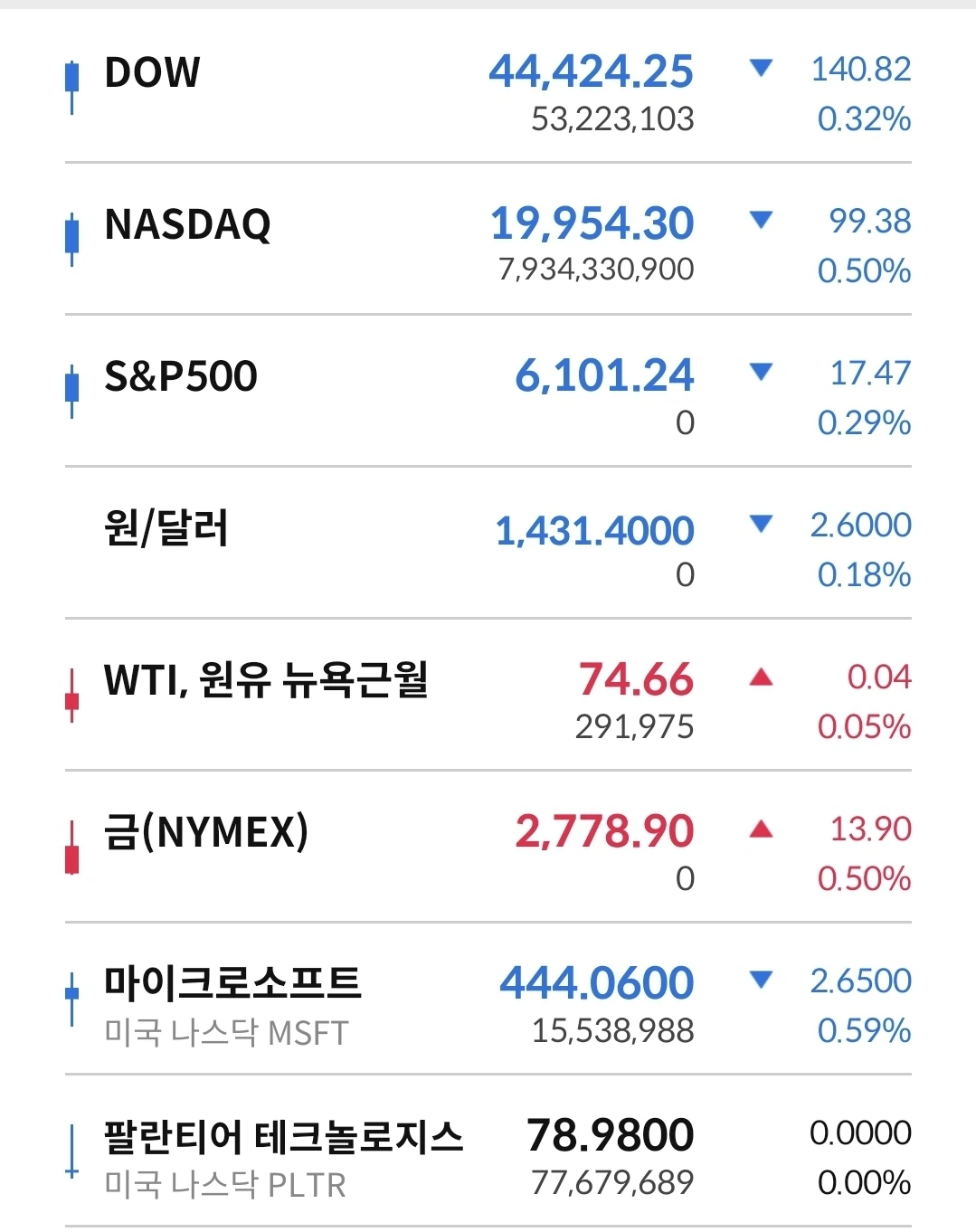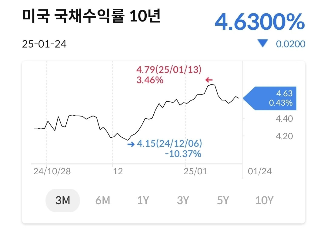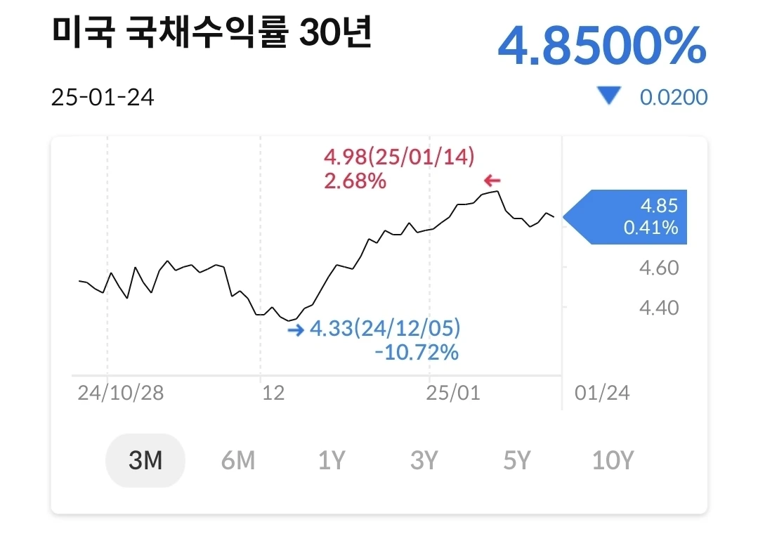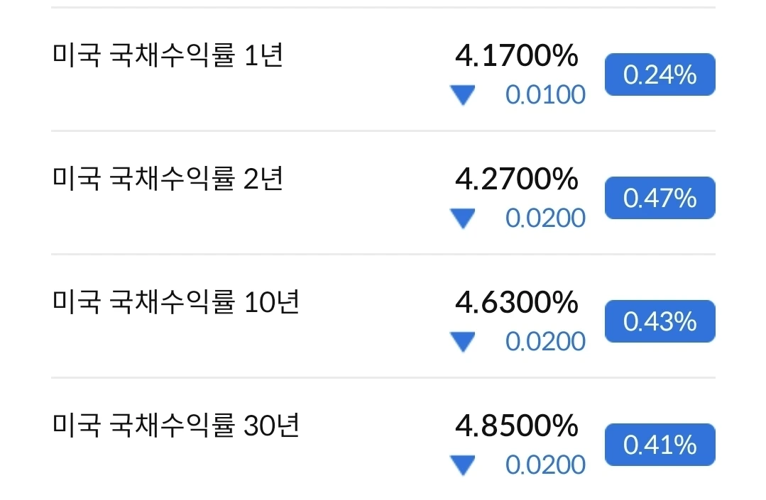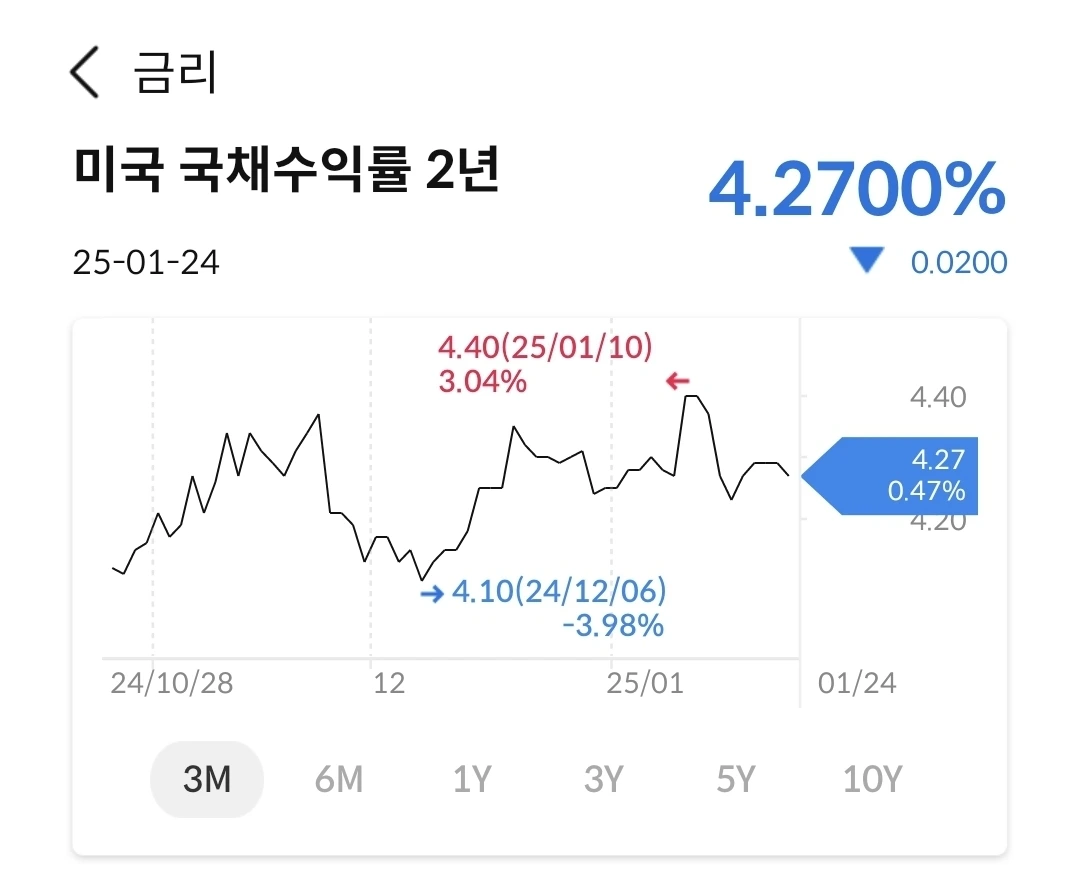 국채수익률은 고점을 찍고 하락 중이다. 트럼프가 지속적으로 금리인하를 압박하면 아마도 국채 수익률은 지속 하락 곡선을 보여 줄 것 같다. 지켜보자.