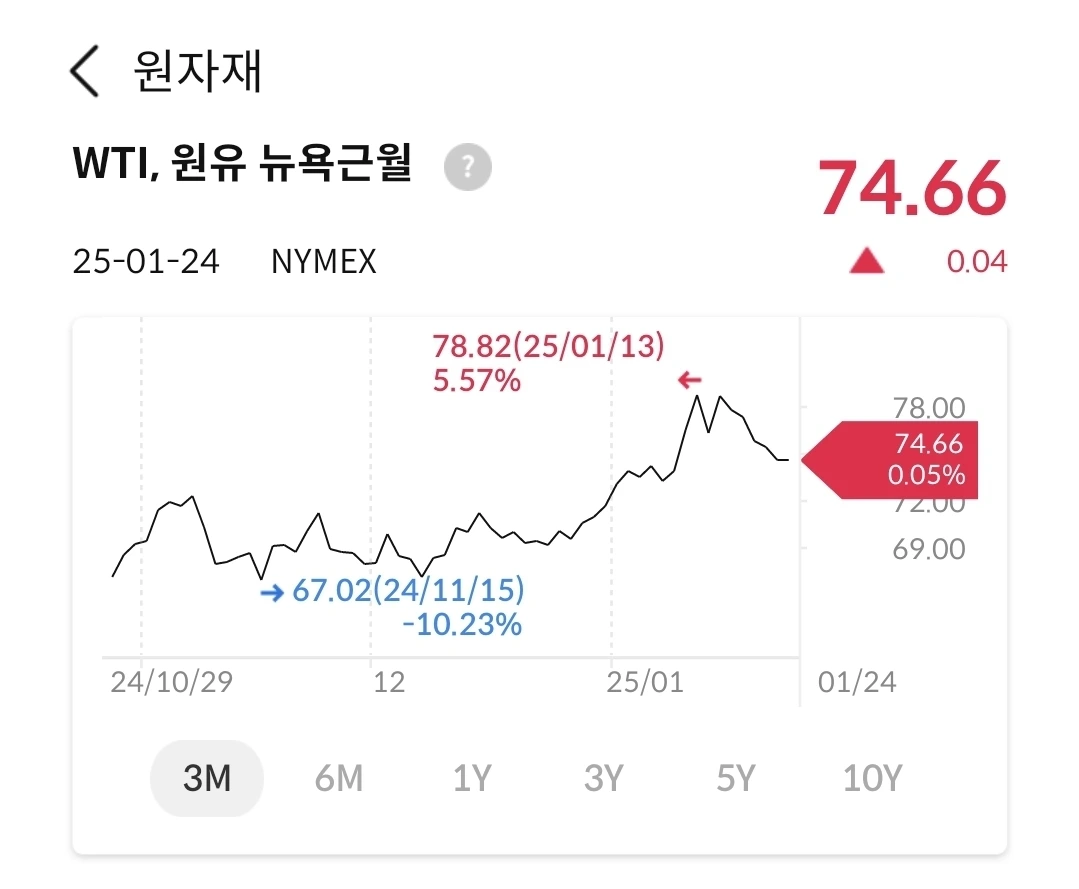 러시아 제재로 크게 상승한 유가는 이스라엘 전쟁 휴전과 중동지역에 유가 인하를 요구하는 트럼프 메시지에 하락 중이다. 미국이 석유 생산을 늘리면 더욱 더 유가는 하락할 것으로 보인다.