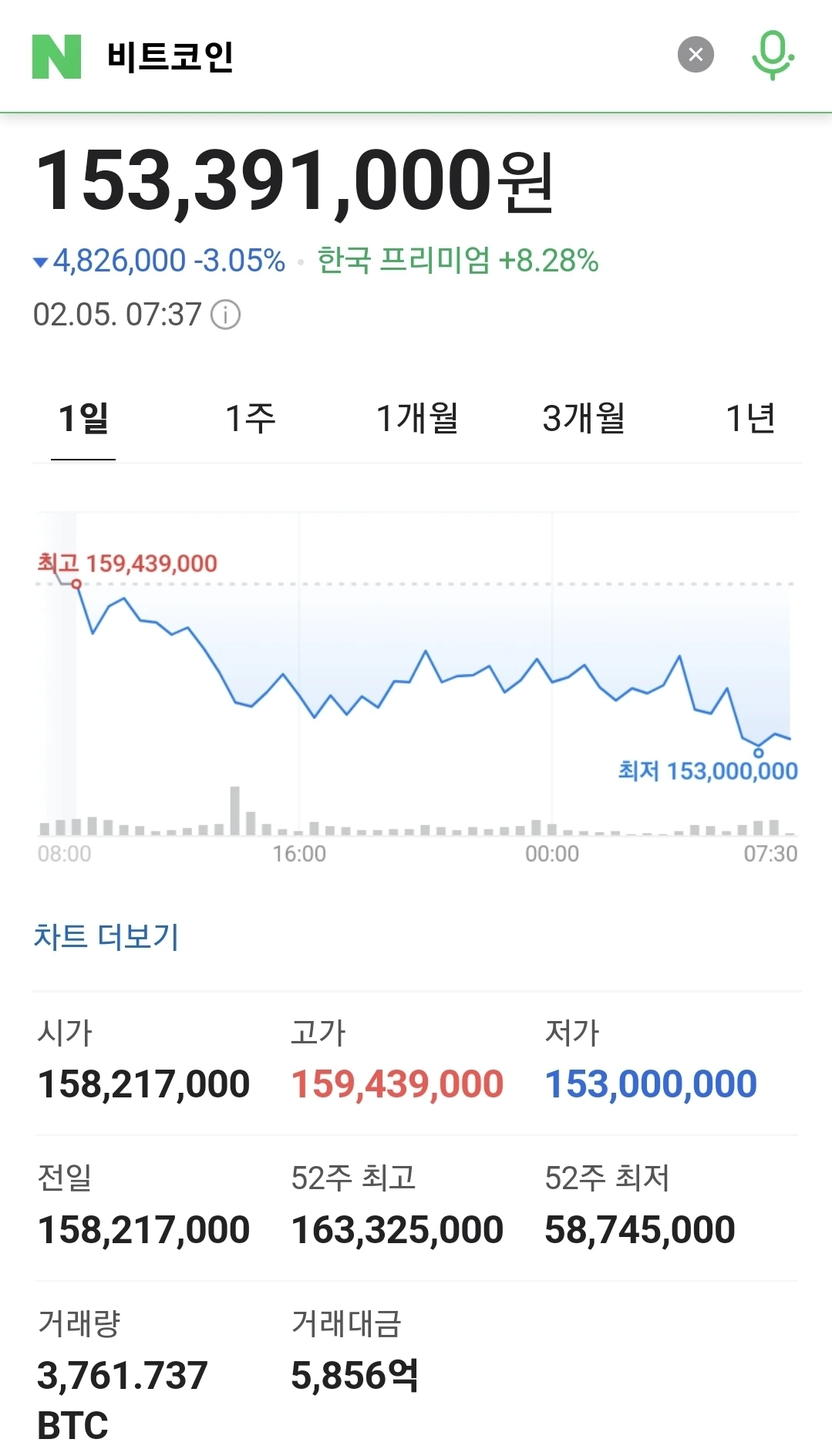 1) 비트코인, 2.43% 하락한 1억5400만원대