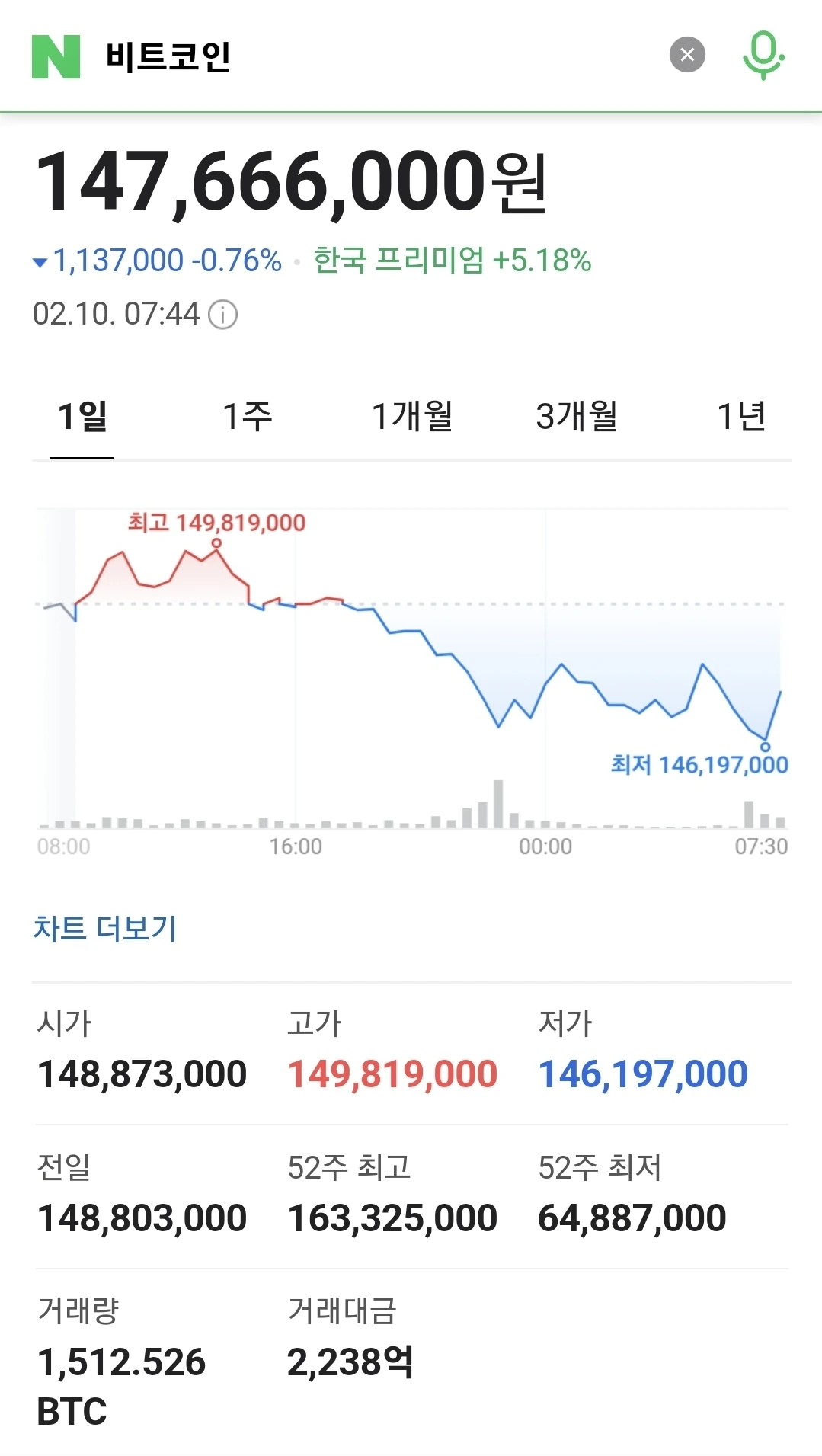 1억5천만원대 반납한 비트코인