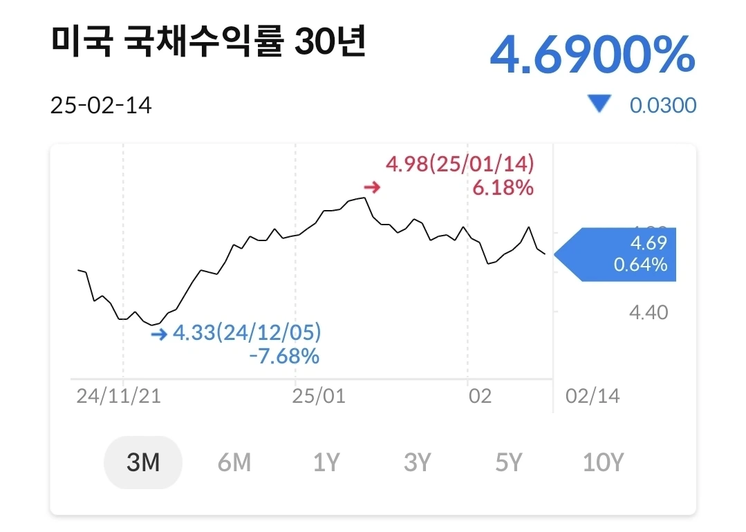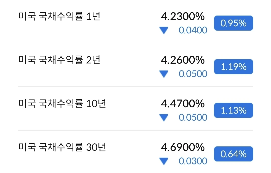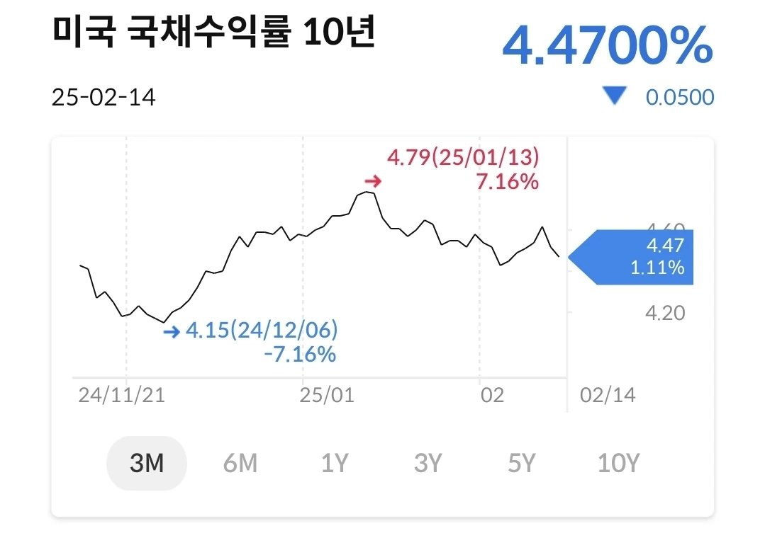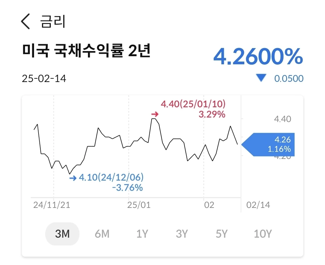 전반적으로 하향 추세이나 트럼프의 입에 따라서 방향이 바뀌고 있다. 국채 수익률이 작년 11월말과 비교하여 아직도 높다. 금리가 동결되면 수익률은 현재의 상황에서 크게 바뀌지 않을 듯 하다. 떨어지는 추세이니 어디까지 내려가는지 주목해 보자. 지금이 미국채를 매수하기에 좋은 시점일수는 있으나, 아직도 시장에 불확실성이 많아서 잘 모르겠다.