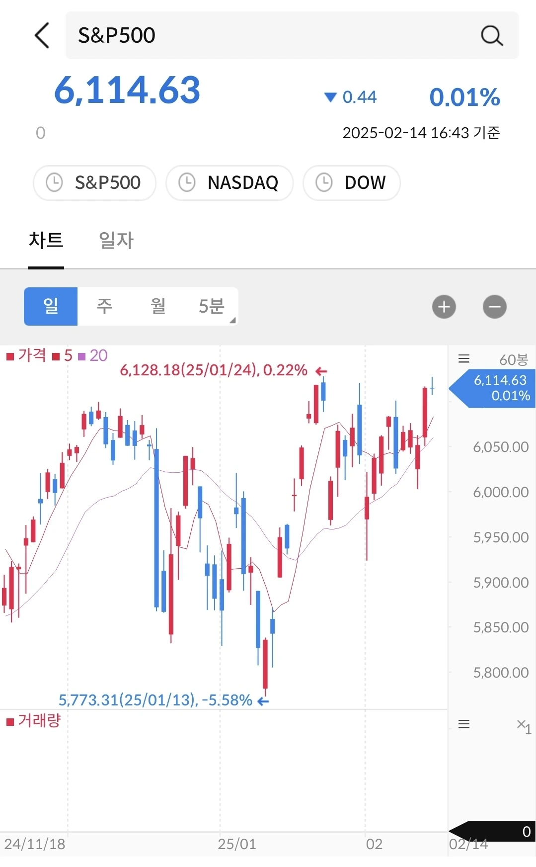 나스닥과 비슷한 패턴이나, 최근 2월은 다우지수와 비슷한 패턴을 보인다. 7주차에는 어느 정도 회복이 된 듯 보인다. 6천포인트를 넘은 것은 안정적으로 우상향 중으로 느껴진다. 꾸준히 모아가면 우상향 효과를 볼 수 있을 듯하다.