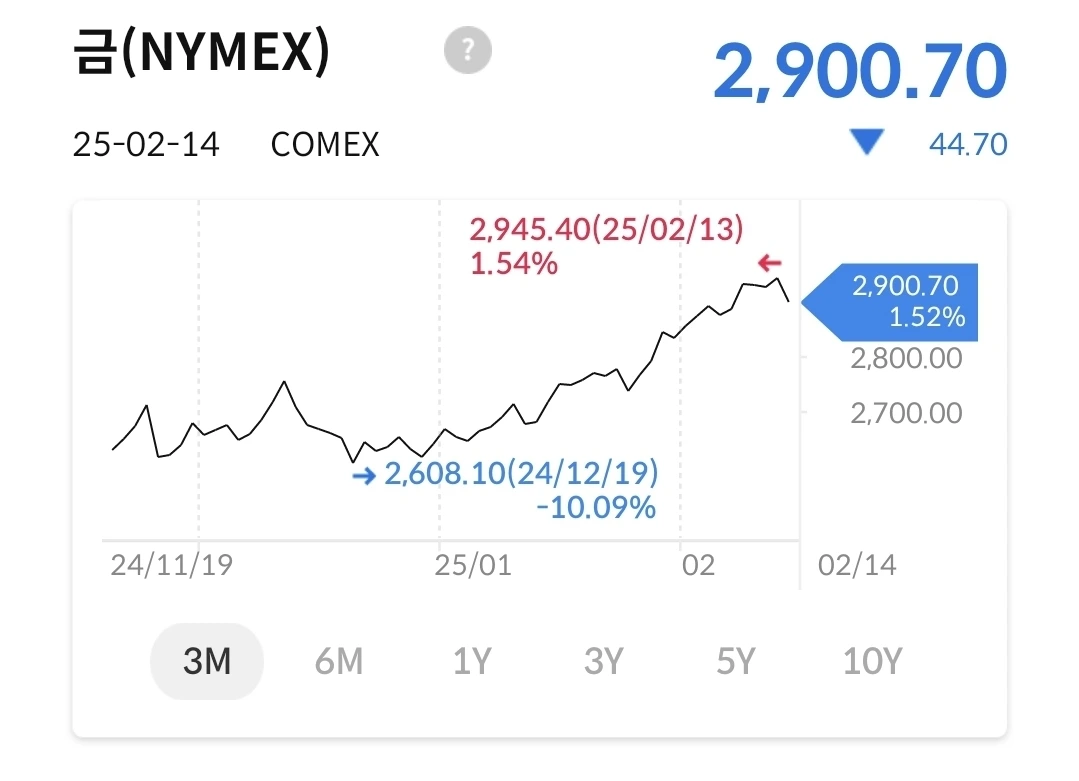 금가격은 숨고르기 하고 있지만, 결국 3천불을 넘어 갈 것이다. 시장이 불안하면 결국 안전자산인 금에 대한 수요가 늘 것이다. 금 가격은 오랫동안 꾸준히 상승 중이다. 이 속도대로면 3천불에서도 더 많이 오를 듯 하다. 금 관련 투자를 하는 것도 장기적으로 보면 좋은 방법일 수 있다.