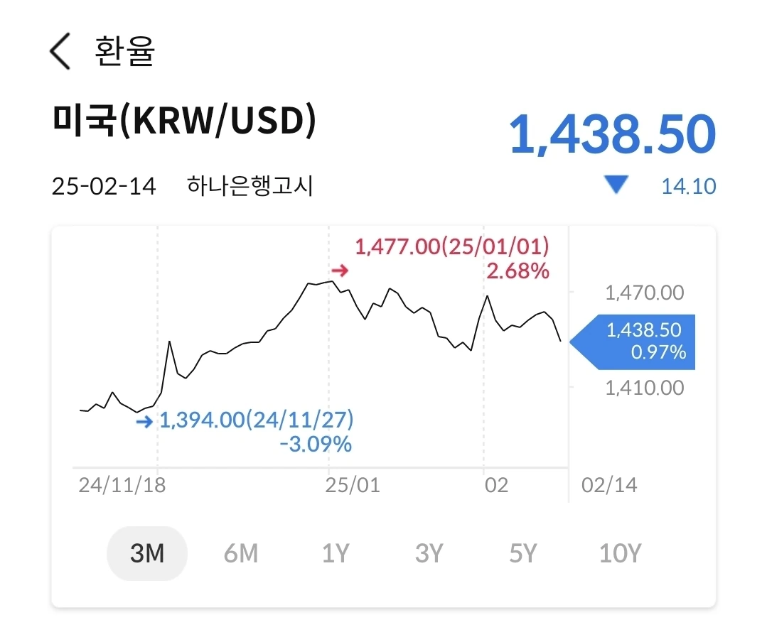환율이 1430원대까지 내려갔다. 계엄 선포 이후 최저 환율이 아닐까 생각된다. 계엄 선포 전에는 1390원대 환율이었다. 다음 주에는 달러를 매수할 기회가 올 듯하다. 잘 보고 있다가 매수를 기회를 잡아 보자. 미국 주식을 살려면 달러가 필요하고, 현재 달러RP의 이자율도 3.75% ~ 4% 대이다. (증권사마다 다르다)
