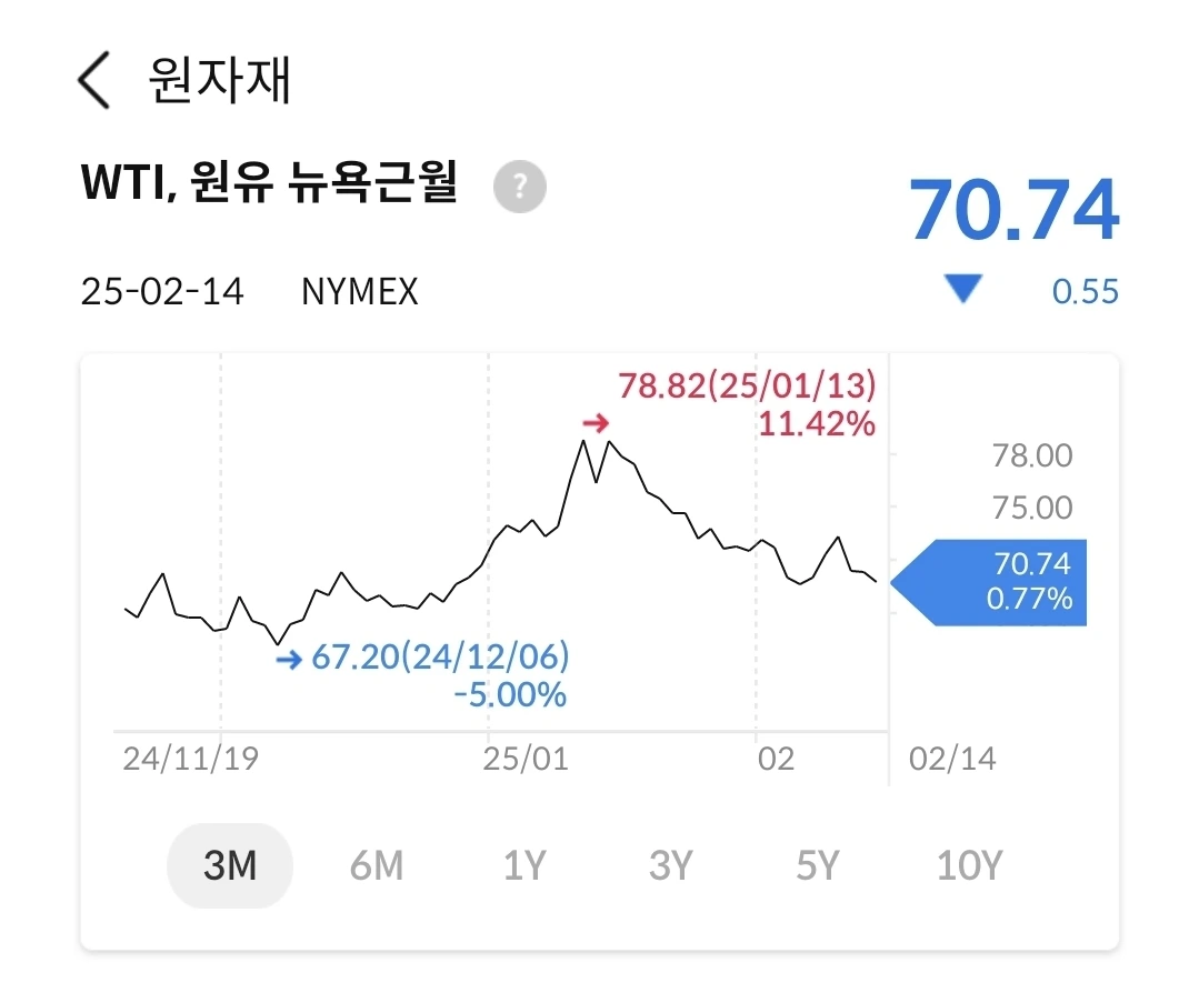 다시 70불대 초반으로 내려왔다. 트럼프가 유가는 낮추기 위해서 노력 중이고, 그 효과를 보는 듯 하다. 다만, 이란 제재의 수위가 올라 가면 70불대 초반에 머무를 수도 있다. 유가와 인플레이션은 직접적인 관계가 있어서 관세로 협상력을 키우려는 트럼프에게는 유가가 낮을 수록 좋다.