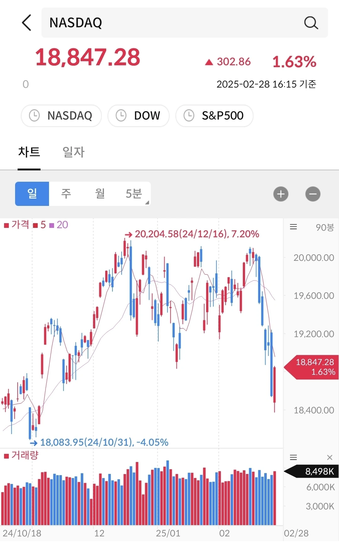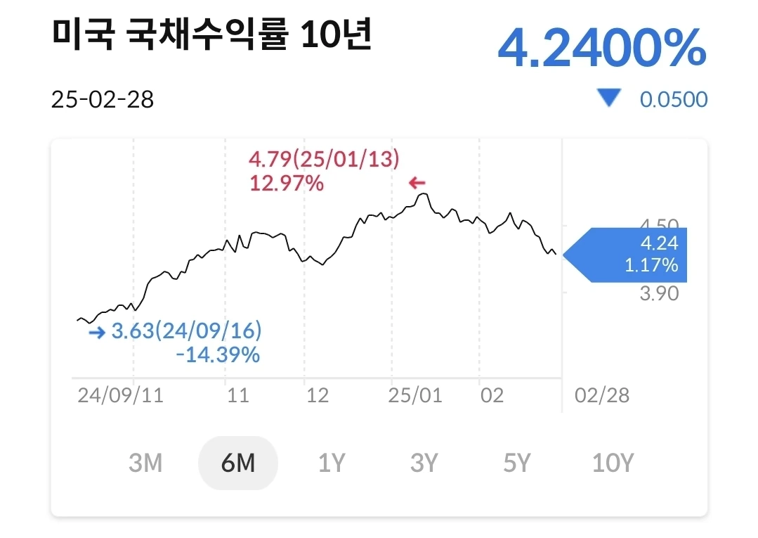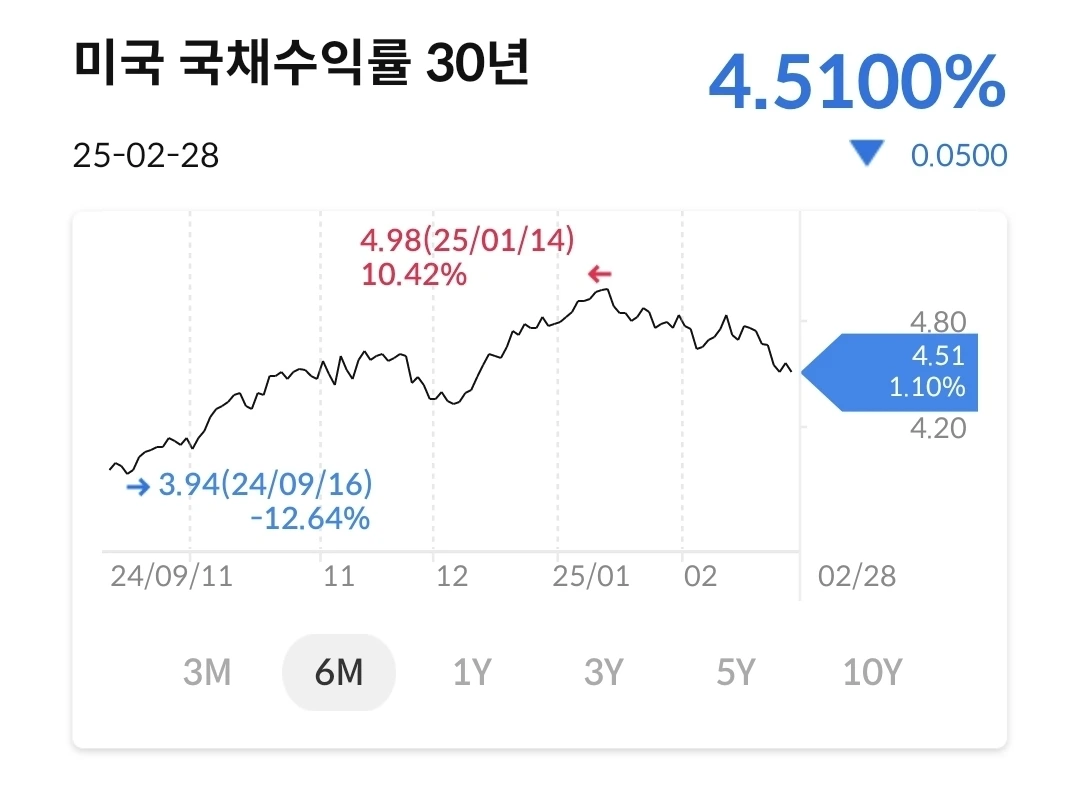 11/4일 미국 대선에 바닥을 찍고, 트럼프 당선 이후에 상승했다가 1월에 다시 하락했다가 트럼프 취임 후에 다시 상승 그리고 관세 시행을 앞두고 다시 하락하는 중이다. 지금은 미국 증시는 트럼프의 입만 바라보면서 미래가치를 선반영 중이다.