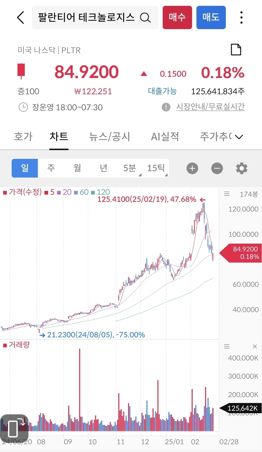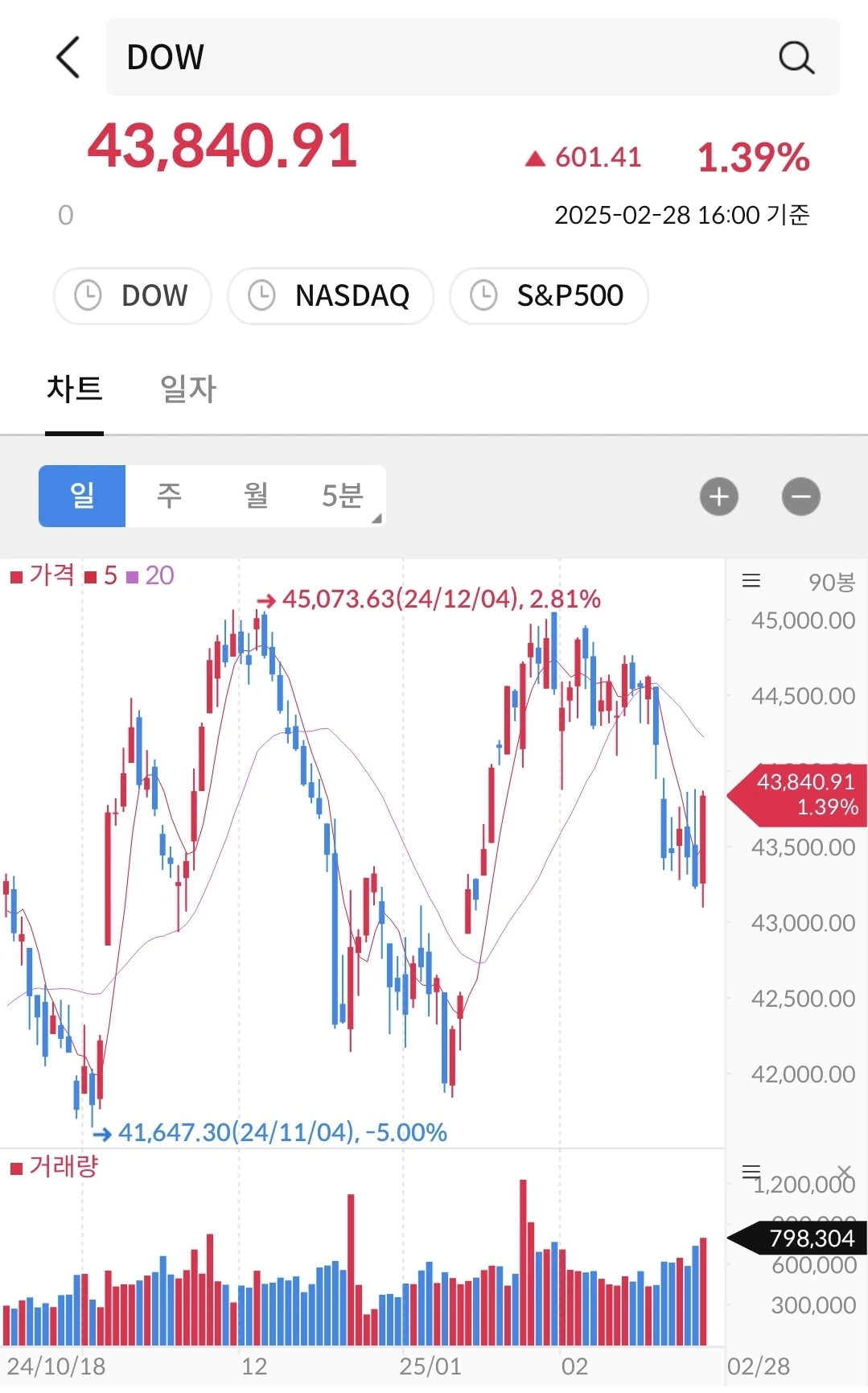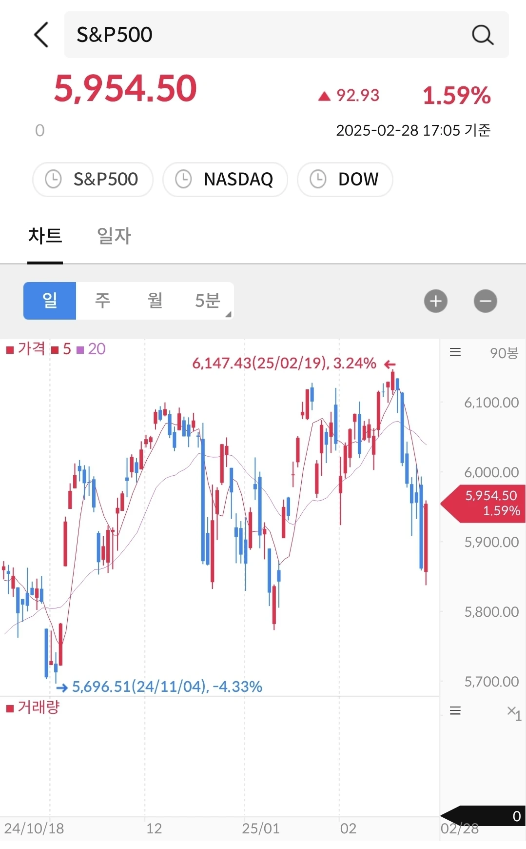 11/4일 미국 대선에 바닥을 찍고, 트럼프 당선 이후에 상승했다가 1월에 다시 하락했다가 트럼프 취임 후에 다시 상승 그리고 관세 시행을 앞두고 다시 하락하는 중이다. 지금은 미국 증시는 트럼프의 입만 바라보면서 미래가치를 선반영 중이다.