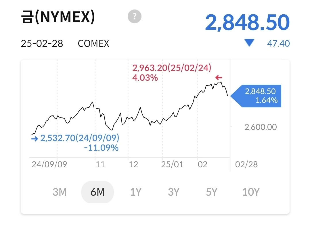 3천을 넘을 것으로 봤는데, 미국 증시와 함께 급락했다. 하지만, 시장에는 금수요가 아직 많기 때문에 조만간 3천이 넘을 것 같다. 안전자산 중에 미국채 수익률이 높기 때문에 금수요가 있는 것이고, 트럼프가 미국 우선 주의를 내세우면서 미국채에 대한 신뢰가 떨어져서 많은 정부에서 금으로 갈아타기 시작했다. 미국채 보유를 가장 많이한 국가는 중국이다. 중국은 미국채 비중을 줄이고, 금을 모으는 중이다.