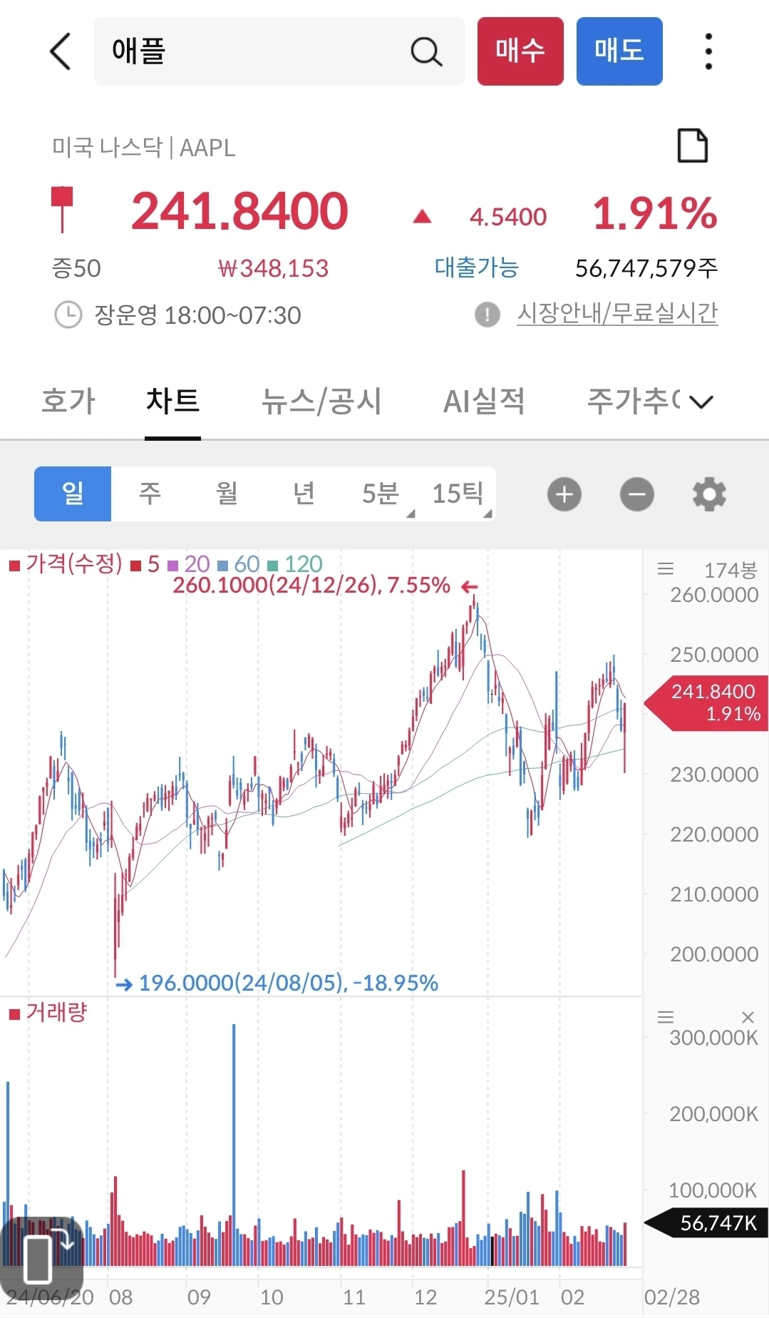 현재 상승 중이다. 이번에 신제품을 발표한 것이 효과가 있는 듯 보인다. 애플의 미래가치도 나쁘지는 않다. 같이 지켜 보자.