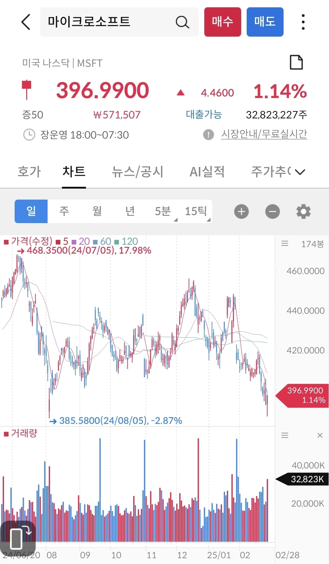 작년 8월 수준까지 떨어졌다. 마소는 현재 시장 상황에 따라 등락을 반복 중이다. 지난 1월 이후에 마소를 조금씩 매수 중이다. 시간이 갈수록 주가가 떨어져서 지켜 보는 중이다. 미래가치를 고민하자.