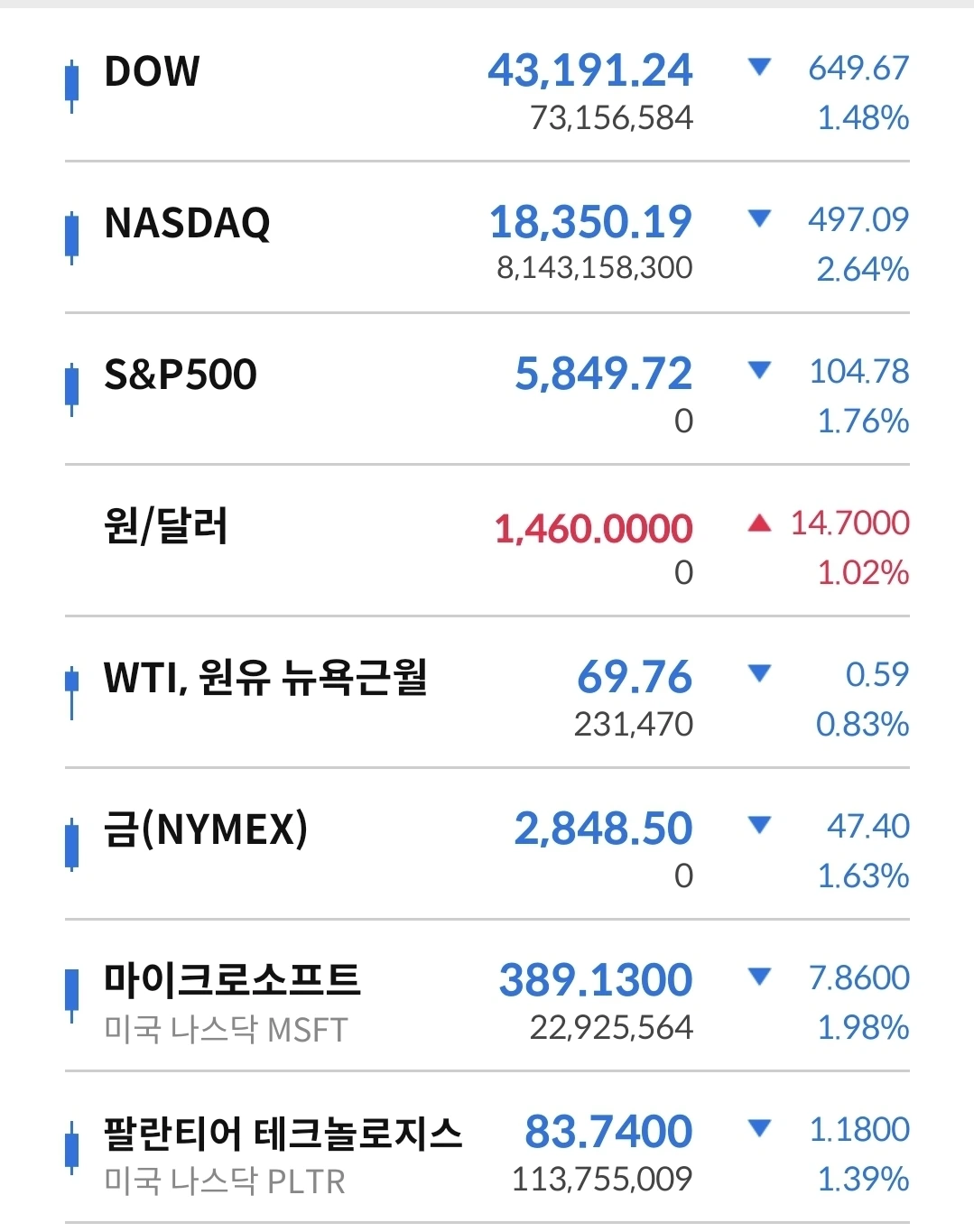 1) 나스닥 2.64%, S&P 1.76%, 다우 1.48% 하락