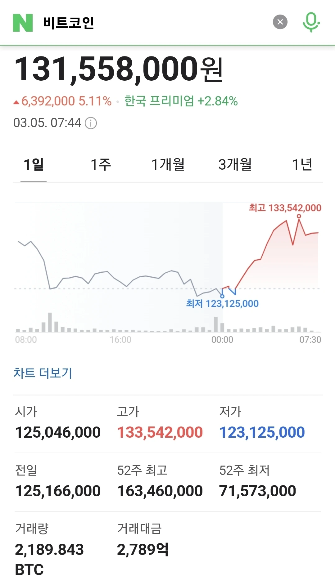1) 비트코인, 4.32% 오른 1억3천만원