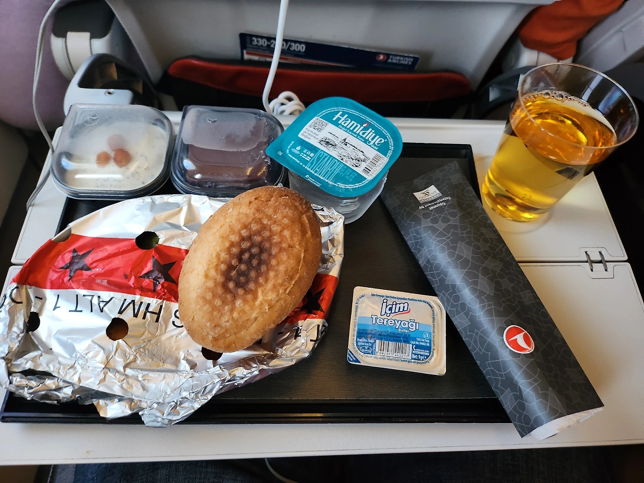 메인을 주면서 어떤 음료를 먹겠냐고 물어봐서 사과주스와 물을 달라고 했다. 주스에 설탕이 많이 들어간다는 내용을 접하고는 가급적 주스를 먹지 않는데, 비행기에서는 술 대신에 주스로 고기의 퍽퍽함을 달래 본다. 그리고, 전식으로 빵과 쨈 그리고 버터가 나온다. 사과 주스는 빵과 잘어울리는 음료이기도 하다. 사과는 원래 아침에 먹으면 약이라고 하는데, 주스는 아닌 듯 하다.