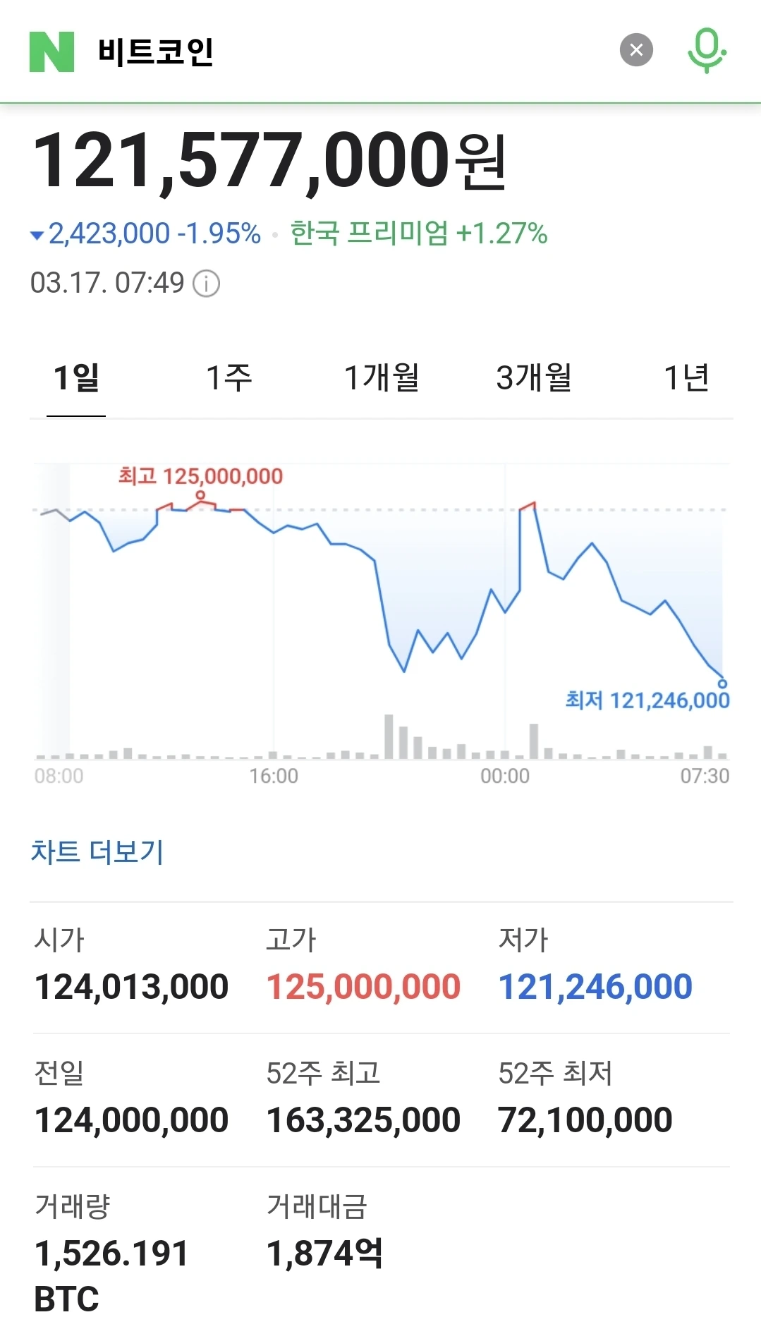 1) 비트코인, 1.01% 떨어진 1억 2162만원