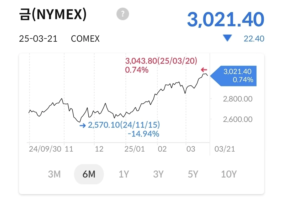 예상대로 3천을 넘겼고, 3,043이라는 신고가도 경신했다. 현재의 불확실성이 지속된다고 하면 금가격은 지속 상승할 것으로 보인다. 그러나, 이미 많이 올라서 계속 올라갈 지는 두고 볼 일이다.
