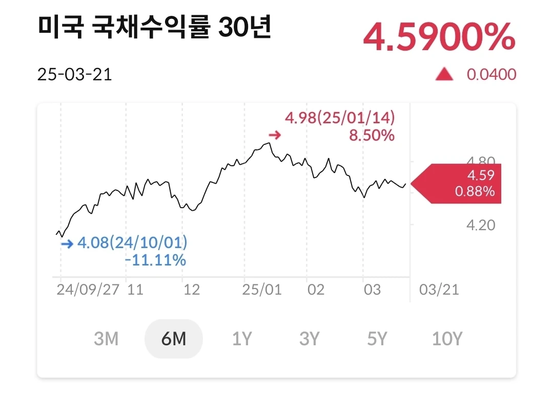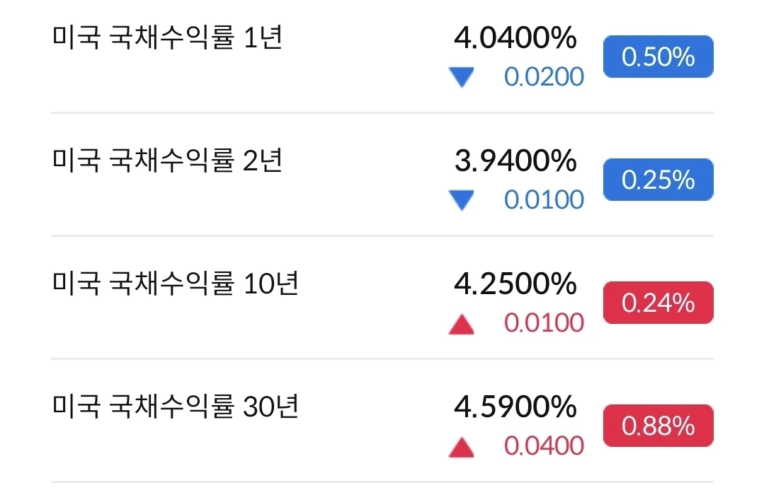 2년물은 3%대로 떨어졌고, 10년물과 30년물도 하락하는 중이다. 국채 가격이 올라간다는 뜻이다. 금리 동결이 영향을 주었을 것이다. 지금은 국채 가격이 올라서, 국채 투자하기 보다는 주식에 투자하는 것이 맞을 것이다. 그러나, 어느 정도 국채를 보유해서 분산투자를 통한 리스크 헷징이 필요하다.
