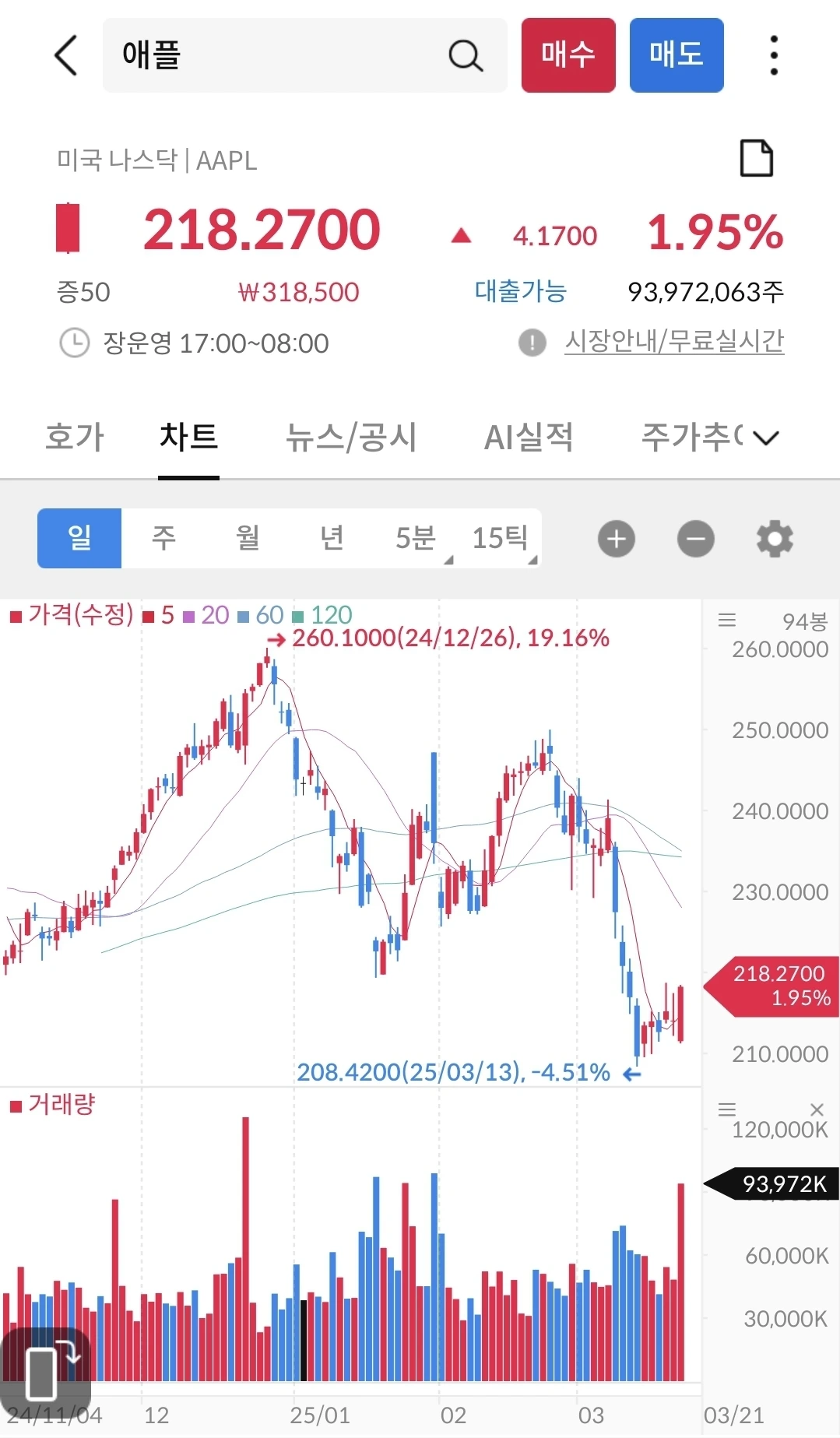 3월 11일에 최저가격을 찍고 소폭 상승 중이다. 그러나 언제 다시 떨어질지 모른다. 지금이 매수의 시점이니 소량으로 매수하면서 가격 추이를 지켜 보면 좋겠다. 난 아직 매수는 하고 있지 않고 기회를 보고 있다.