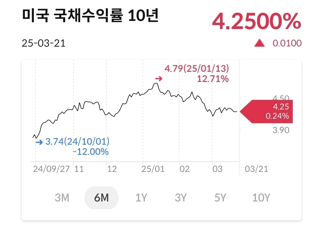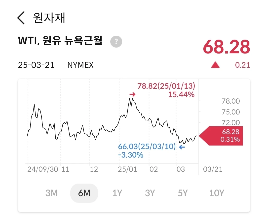 3월 10일에 최저가를 찍고 70불 아래에서 등락을 반복 중이다. 트럼프가 인플레이션을 우려하여 중동 국가에 유가를 내리라고 압력을 넣고 있다. 결국 시장은 수요 공급의 원리로 움직일텐데, 이란 제재와 이스라엘이 촉발한 중동 지정학적 긴장은 유가를 상방 압력하기에 충분하다. 그럼에도 불구하고 유가는 70불대 아래에 있다.
