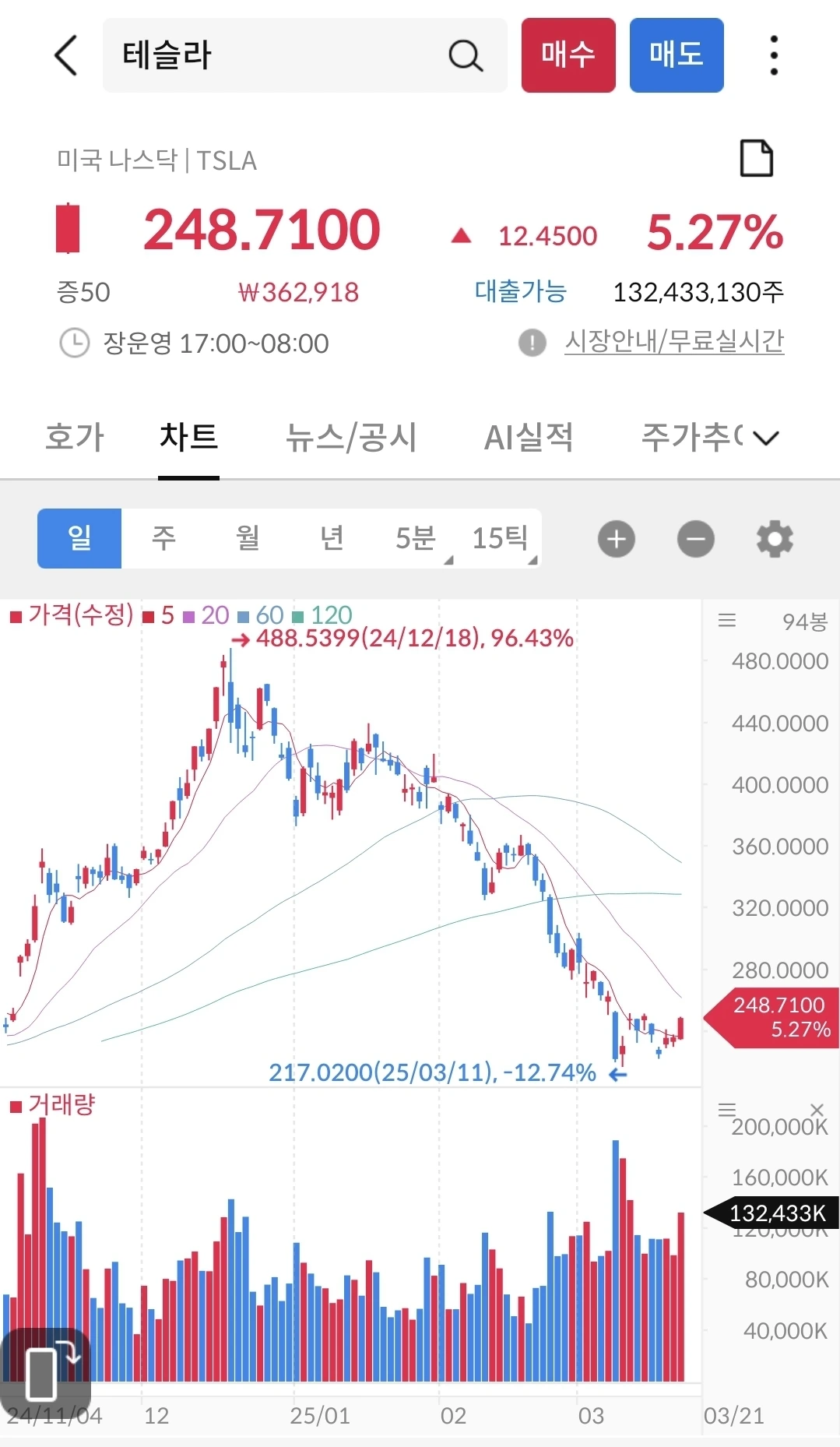테슬라 주식은 내가 선호하지 않는 주식 중에 하나이다. 주변에 많은 분들이 매수와 매도를 반복하셔서 그 트랜드가 궁금해서 일주일에 한 번 정도 볼려고 한다. 지난 12월 18일 대비 주가가 반토막이 났다. 아마도 오너 리스크가 제일 커 보인다.
