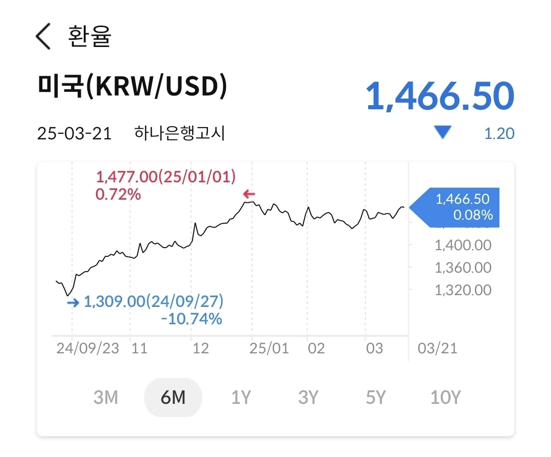 지난 1월 1일에 1477원을 찍고 1400원대에서 등락을 반복하다가 지난 금요일에 1466원까지 올라 갔다. 장중에는 1470원까지 갔었다는. 문제는 달러가 약세로 가도 원화가 강세로 전환이 안 된다는 것이다. 원화는 외부 요인의 영향보다는 국내 정세의 불안함이 더 많은 영향을 준다는 느낌이다.