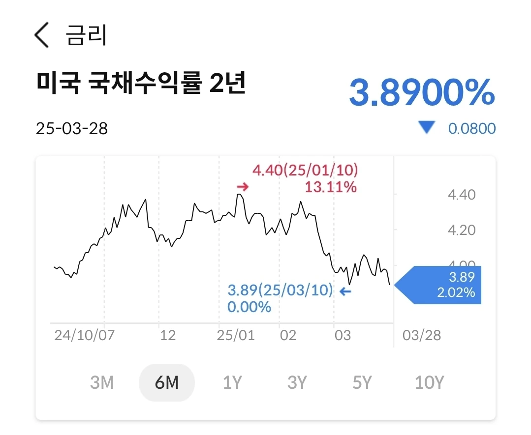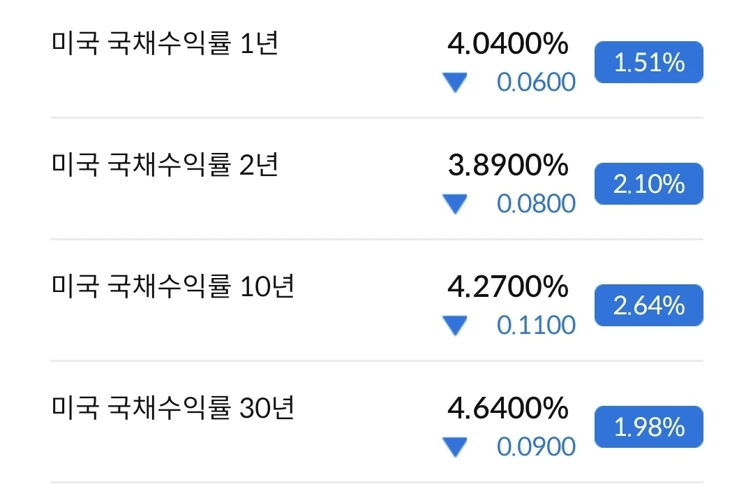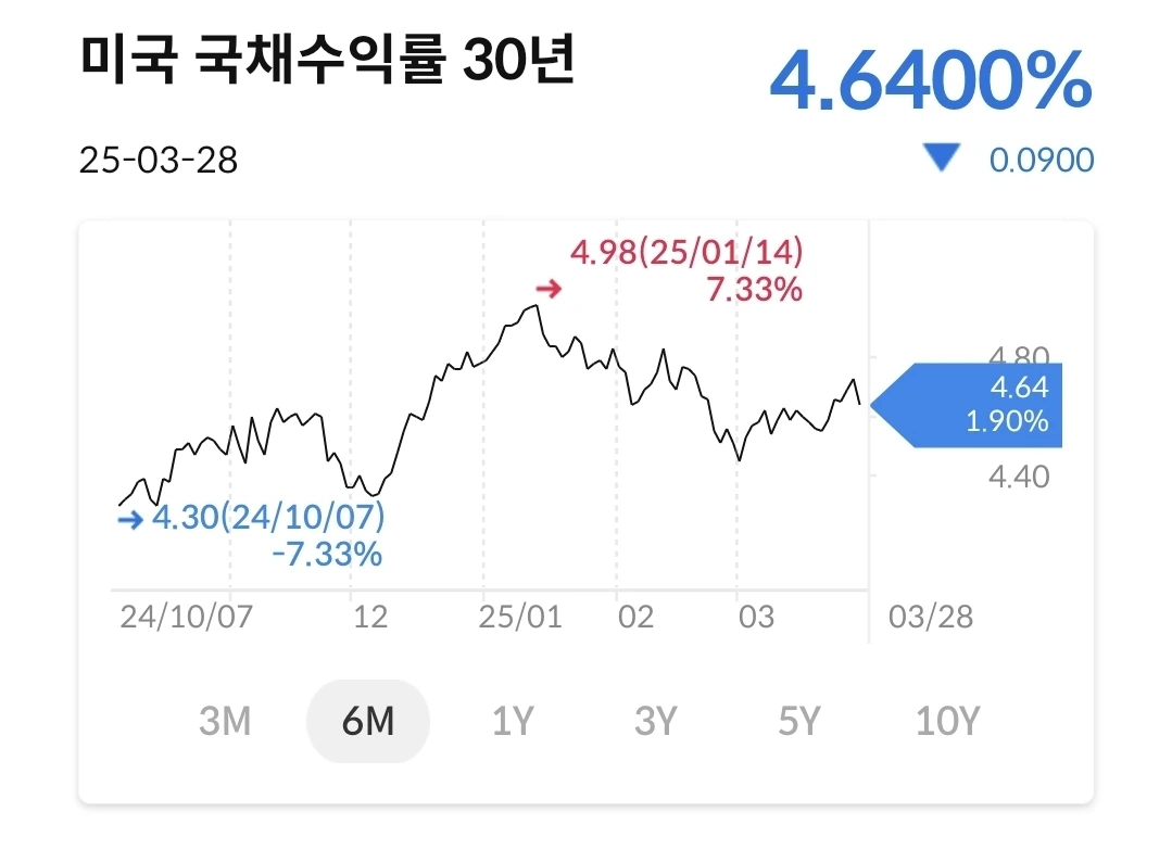 국채수익률은 다행인지 하락 중이다. 국채 가격이 인상되고 있다는 의미이다. 아직도 수익률이 높은편이데, 다시 3%대로 갈 수 있을 지 지켜보고 있다.
